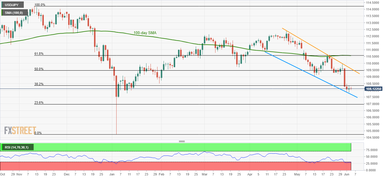 Disrespecting its bounce from nearly one-month-old support-line and a pullback from 38.2% Fibonacci retracement, the USD/JPY pair is taking the rounds near 108.10 during early Wednesday.