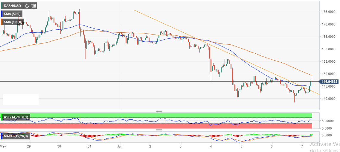 However, it is not clear if the iOS upgrade can sustain the current gains. DASH/USD is trading at $147.26 while supported by the 50 SMA at $145. On the upside, the 100 SMA is hindering growth to $150 level.