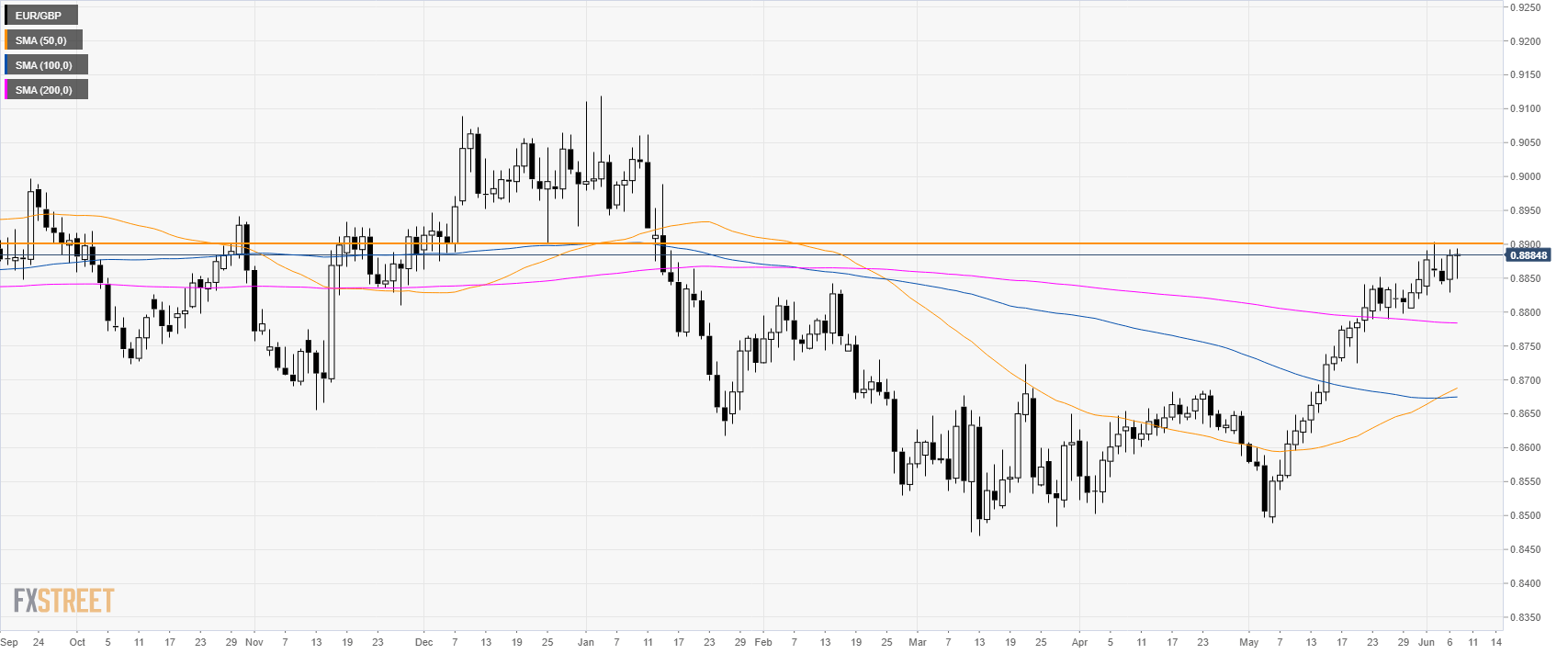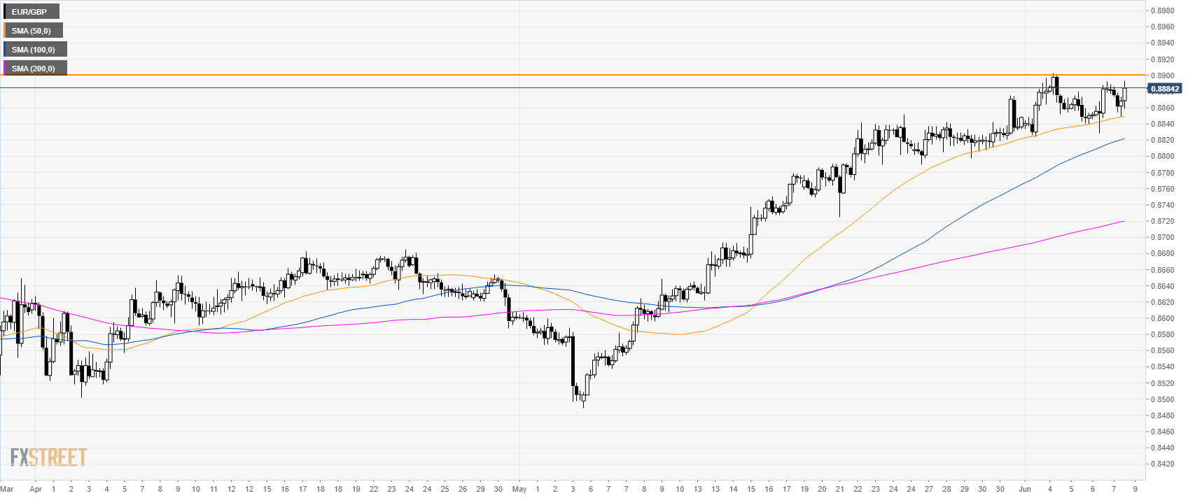 EUR/GBP had a strong bull trend in May. The market is now consolidating the gains below the 0.8900 figure.