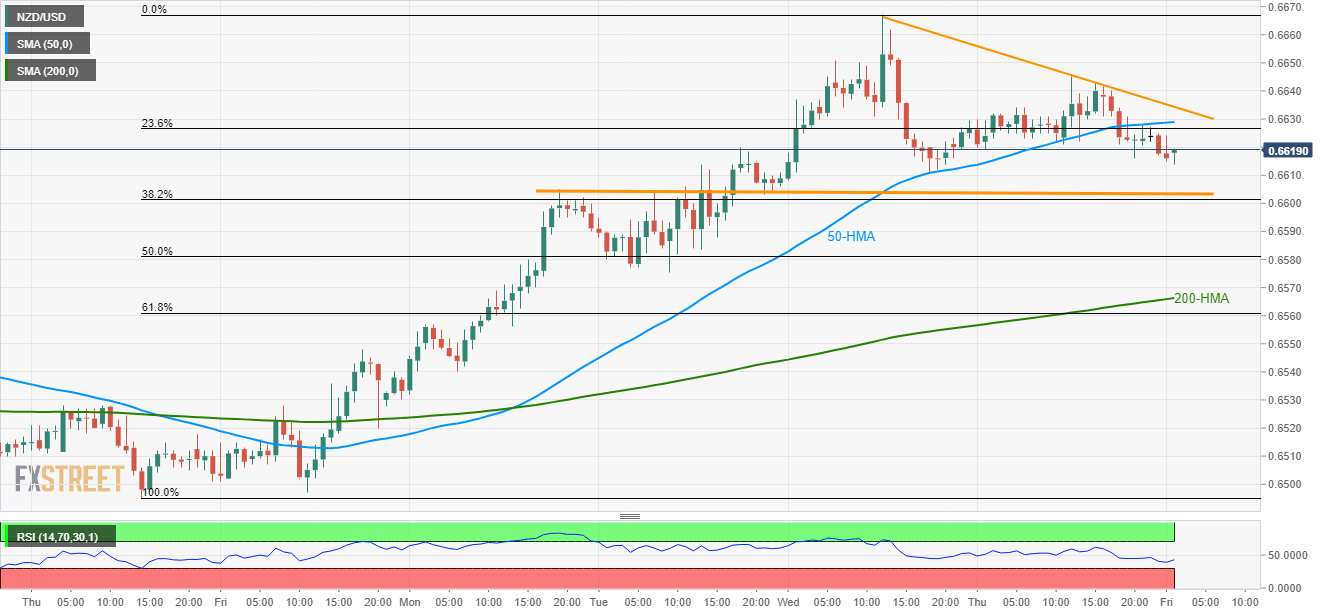 In addition to immediate descending trend-line, slip beneath 50-HMA also portrays the NZD/USD pair’s weakness while it trades near 0.6616 on early Friday.