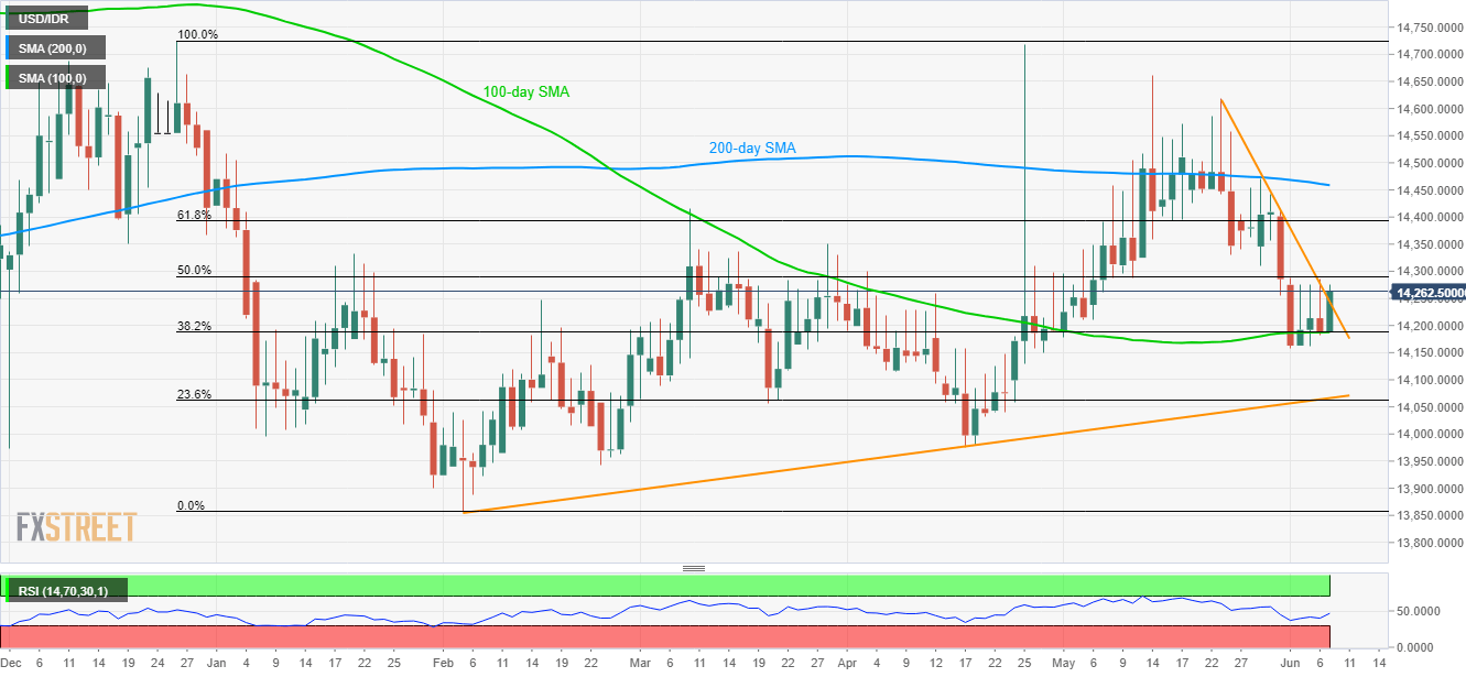 Despite being positive beyond 100-day SMA, USD/IDR lacks upside momentum as 50% Fibonacci retracement limits the quote’s strength as it takes the rounds near 14,262 during early Friday.