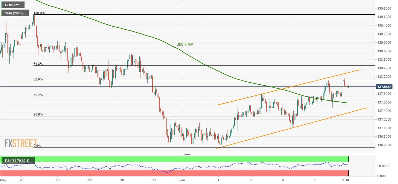 GBP/JPY’s latest pullback still falls short of challenging a week-old trend rising trend channel as the pair seesaws near 137.95 during early Monday.