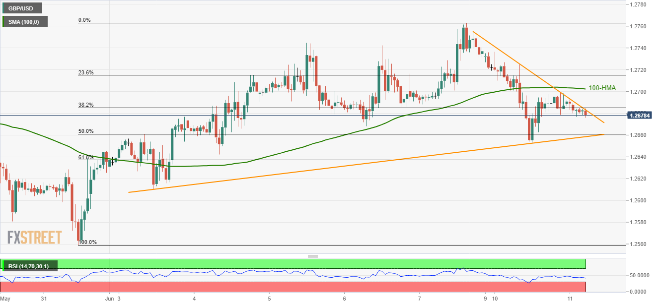 Meanwhile, a week-long upward sloping support-line and 61.8% Fibonacci retracement near 1.2660 can be targeted if holding short positions.