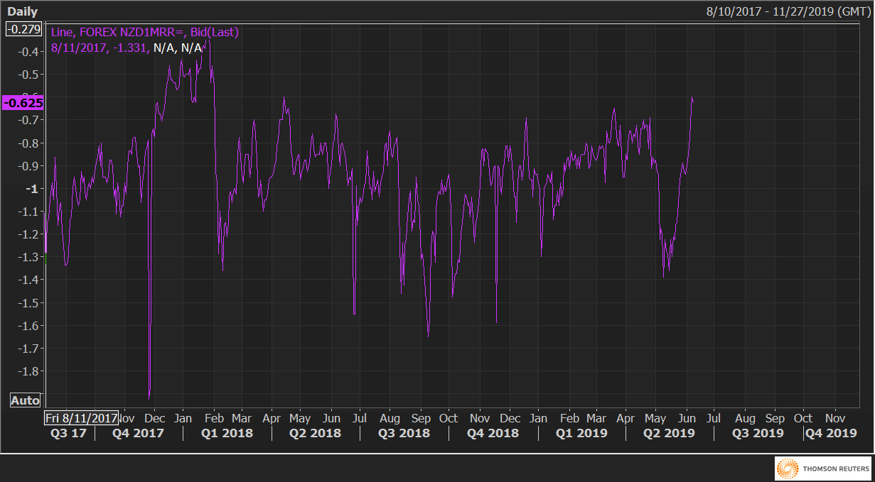 One-month risk reversals on NZD/USD rose to -0.60 on Monday, the highest level since April 2018, indicating the premium for put options is still higher than that for calls, but is currently at the lowest in 14 months.