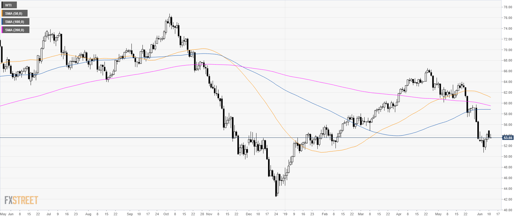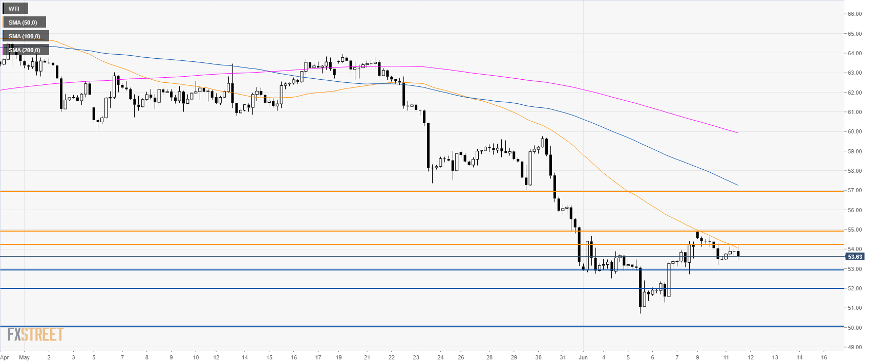 WTI (West Texas Intermediate) is under bearish pressure below $55.00 a barrel and its main simple moving averages (SMAs).