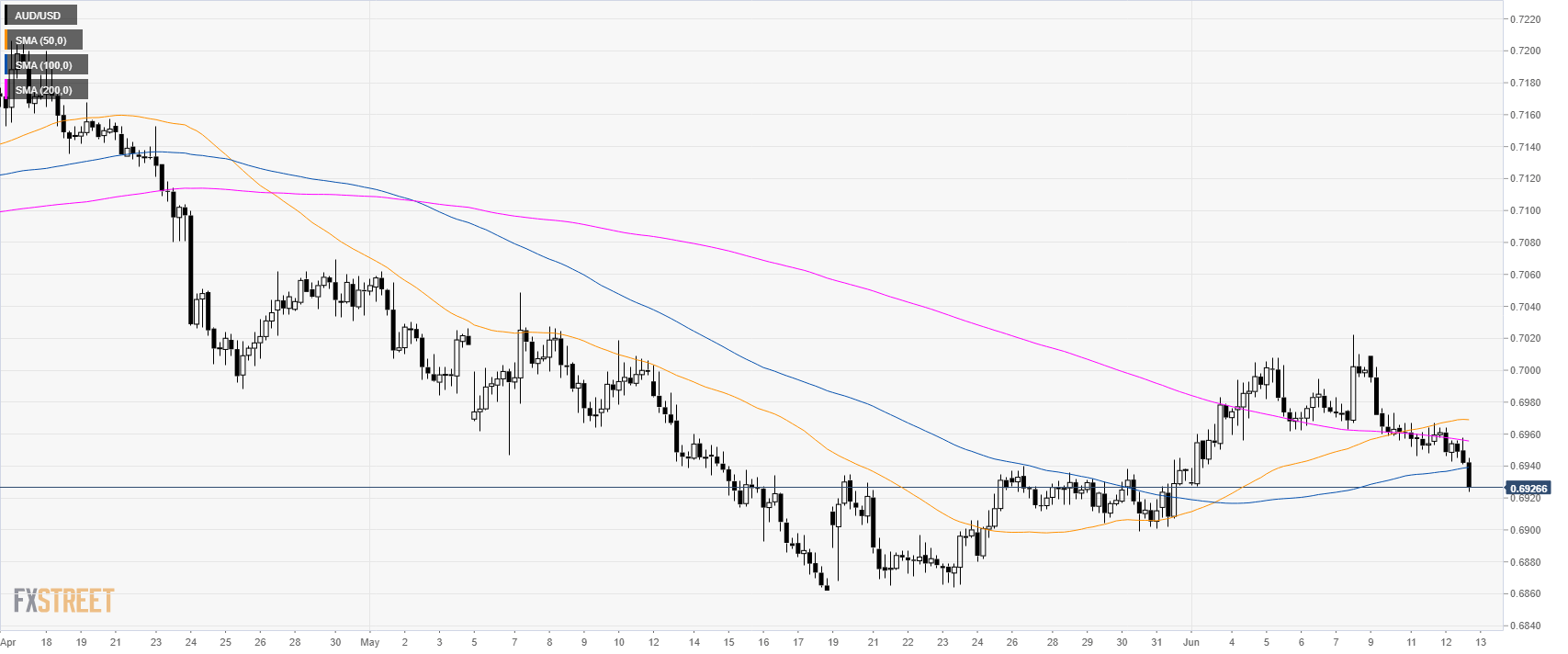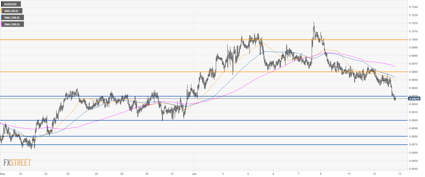 AUD/USD is under bearish pressure below its main SMAs. A sustained break below 0.6930 can send the Aussie to 0.6900 and 0.6880/70. Resistances are seen at 0.6960 and 0.7000 levels.