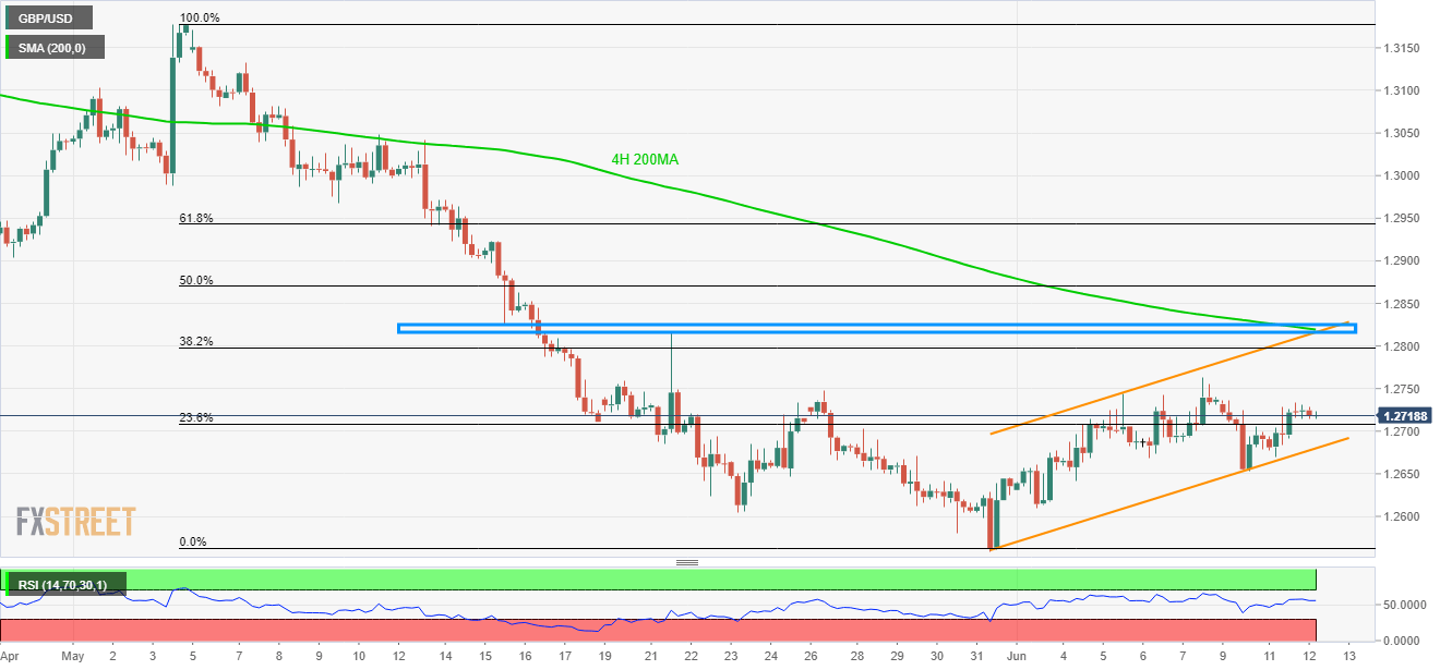Despite lack of momentum, a 12-day long ascending trend-channel portrays the GBP/USD pair’s strength as it trades near 1.2720 ahead of the London open on Wednesday.