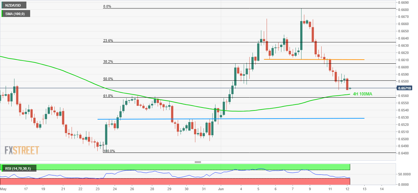 While sustained trading beneath 0.6610 portrays the NZD/USD pair’s weakness, 100-bar moving average and 61.8% Fibonacci retracement can limit further declines of the quote that seesaws around 0.6570 while heading into European open on Wednesday.