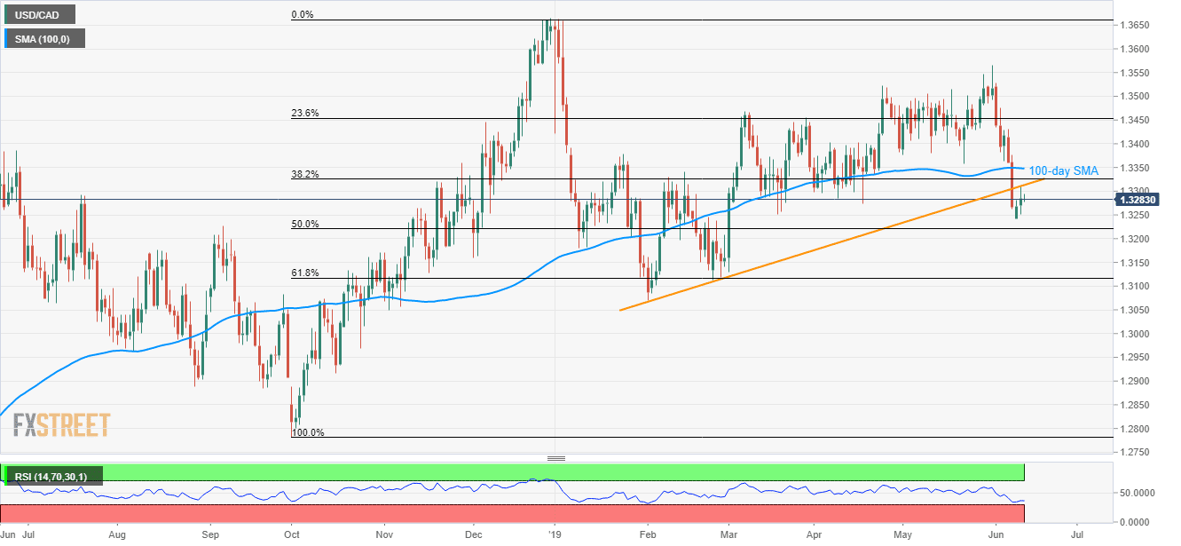 Out of them, an 18-week long ascending trend-line (previous support now resistance) becomes the closes limit at 1.3315, a break of which may escalate the recovery towards 1.3325 figure comprising 38.2% Fibonacci retracement of its October 2018 to January 2019 upside ahead of questioning the 100-day simple moving average (SMA) level of 1.3348.