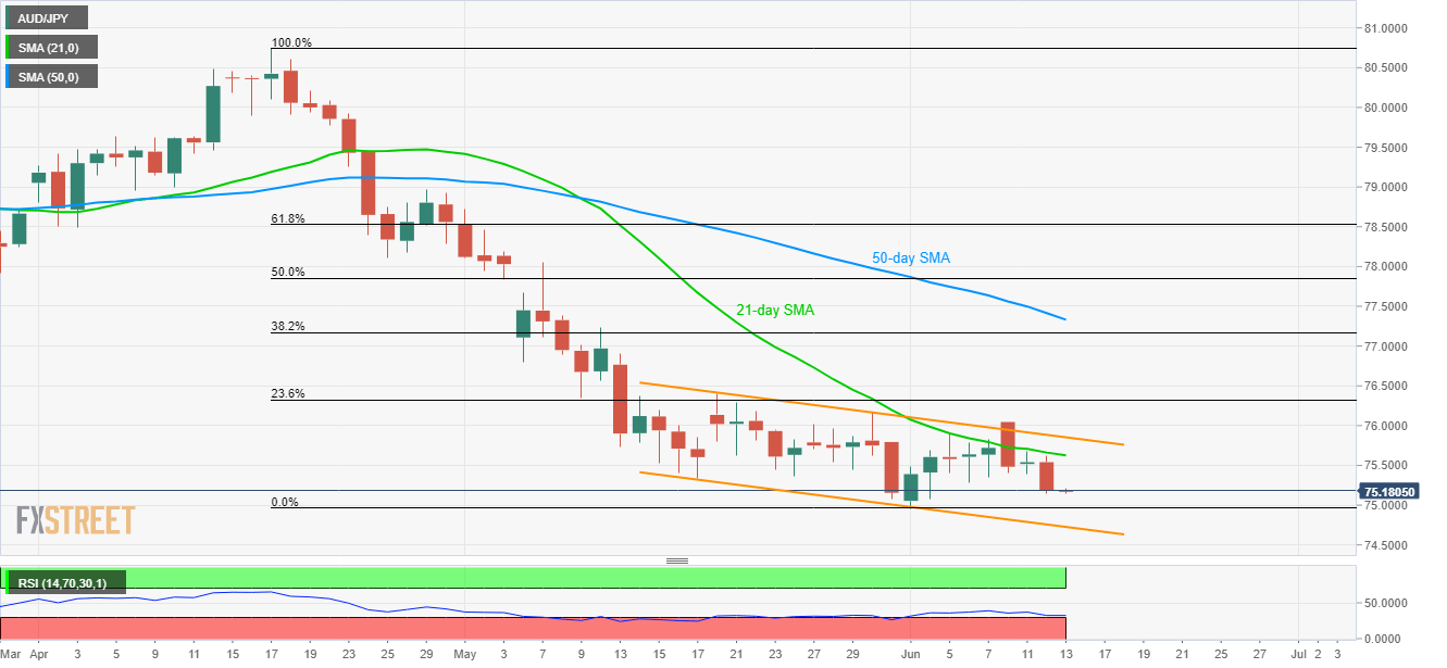 AUD/JPY technical analysis: Sellers aim for 74.96 inside descending channel