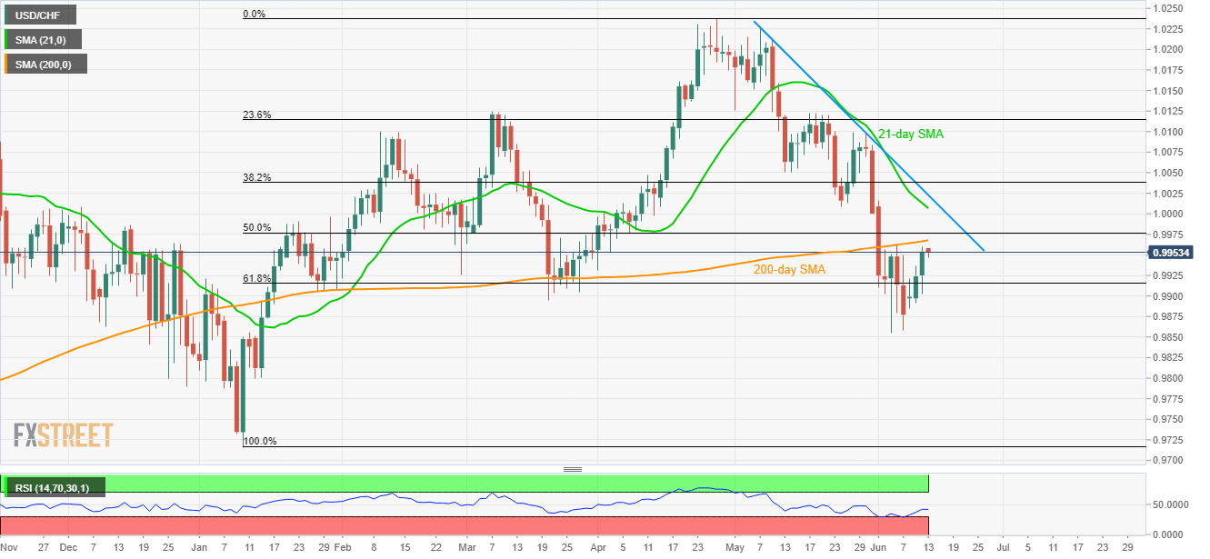 USD/CHF’s recent recovery still falls beneath 200-day SMA as it takes the rounds near 0.9950 during the early Asian session on Thursday. The pair traders now await monetary policy decision and assessment from the Swiss National Bank (SNB) for fresh clues.