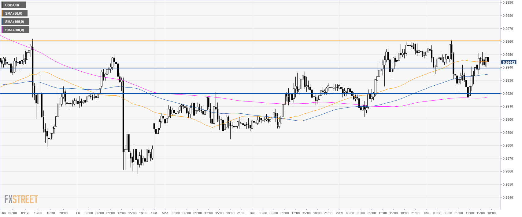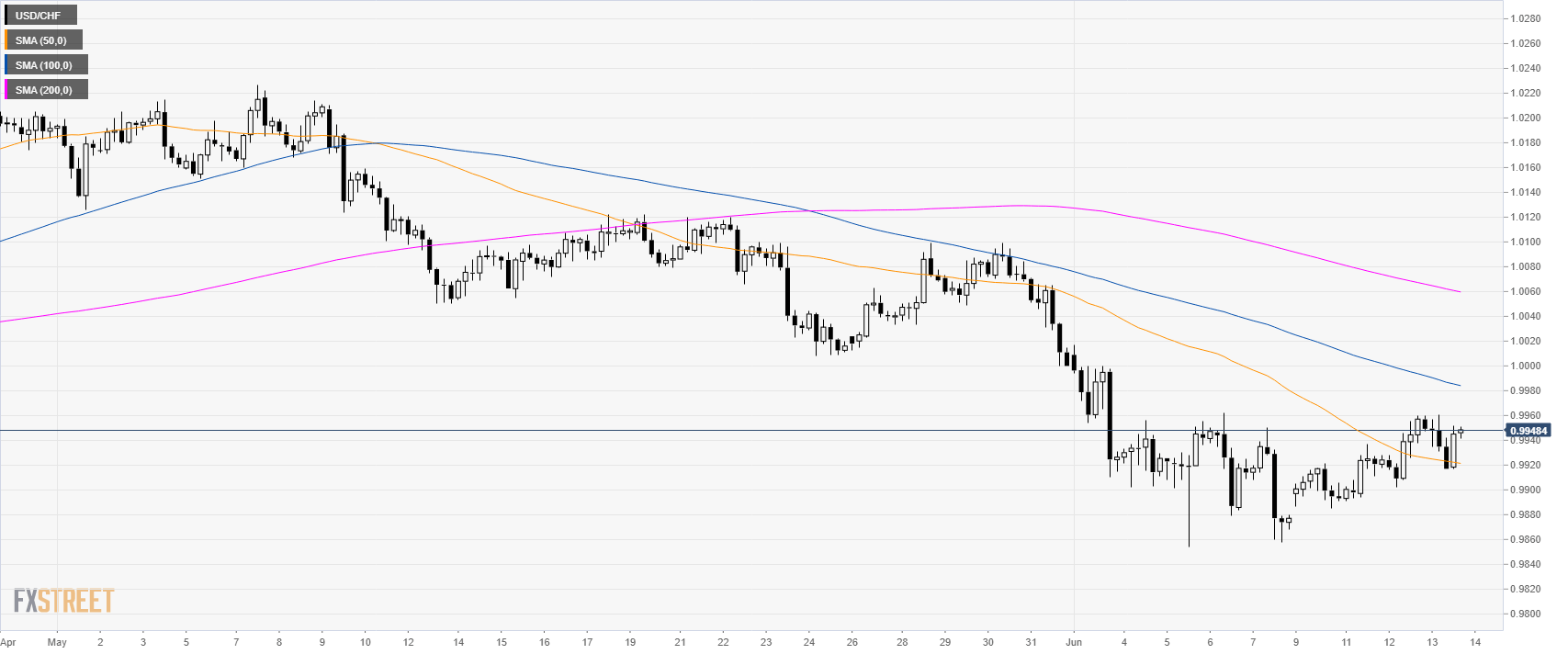 USD/CHF is trading near Wednesday high and above its 50 SMA.