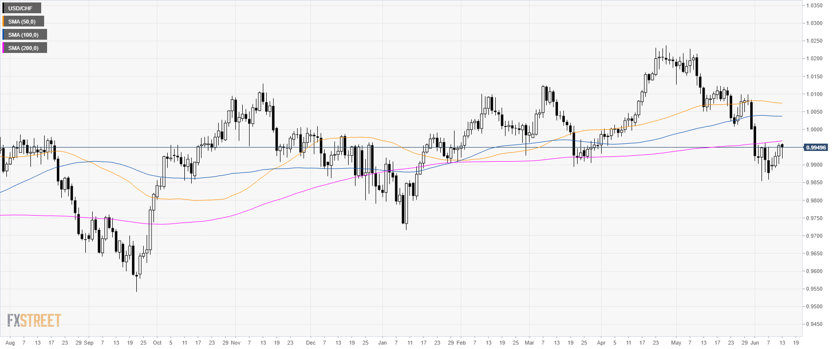 USD/CHF is in consolidation mode below the parity level and its 200-daily simple moving average (DSMA).