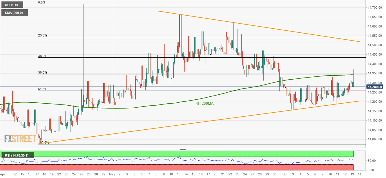 Failure to hold the break of 4H 200MA and 50% Fibonacci retracement propelled, presently pulls the USD/IDR pair towards 61.8% Fibonacci retracement as the quote is taking the rounds to 14,280 during initial Friday.