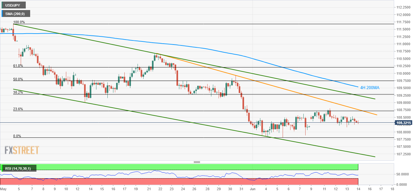 While a downward sloping trend channel aptly portrays the USD/JPY pair’s decline since early May, the latest pullback from 23.6% Fibonacci retracement drags it towards 108.32 during early Friday.