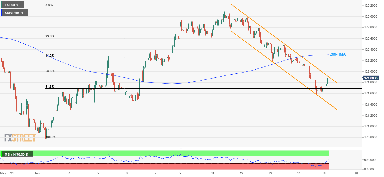 Despite bouncing off 61.8% Fibonacci retracement of current month upside, the EUR/JPY pair struggles with the short-term descending trend-channel resistance while trading near 121.85 during early Monday.