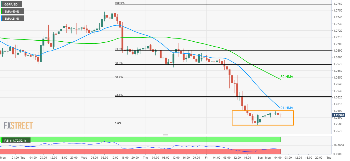 While latest lows surrounding 1.2580 limits the pair’s immediate declines, 21-hour moving average (HMA) caps the adjacent rise around 1.2605.