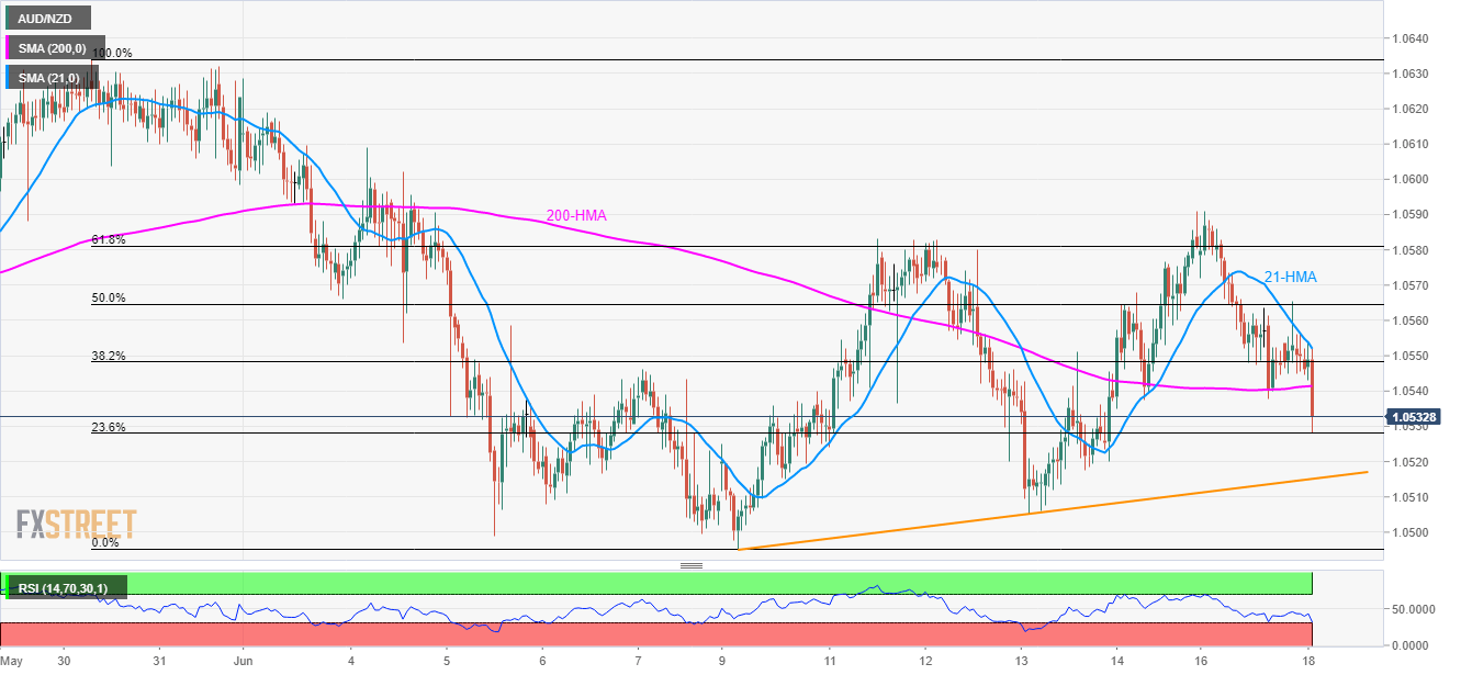 The downbeat tone of the RBA minutes and sluggish house price data from Australia dragged the AUD/NZD pair to 1.0530, below 200-hour moving average (HMA), during early Tuesday.