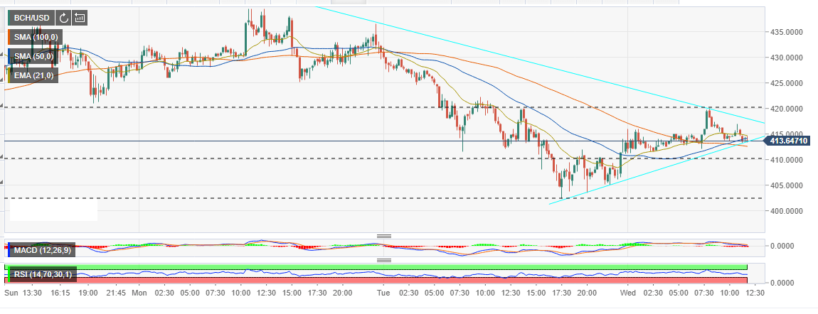BCH/USD is among the cryptocurrencies that are holding on to the slightly intraday gains on Wednesday. A recovery staged yesterday saw Bitcoin Cash brush shoulders with $420. The decreasing buying pressure failed to break past the trendline resistance. Bitcoin Cash has since retreated below $415 and the is trading marginally below the 50 Simple Moving Average (SMA) 15-mins.
