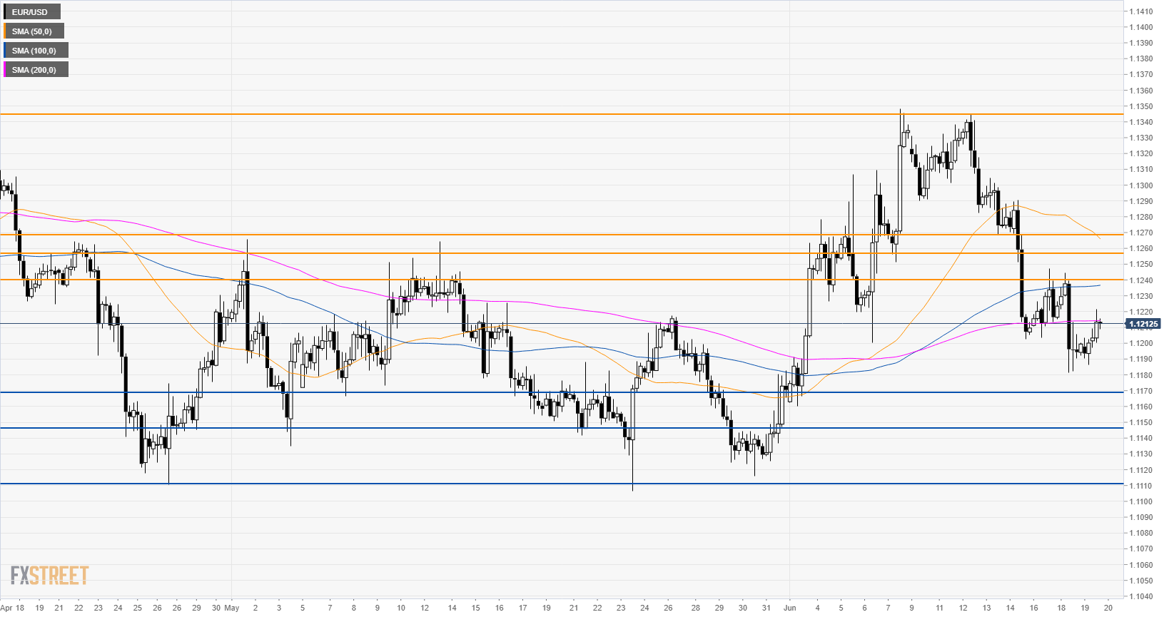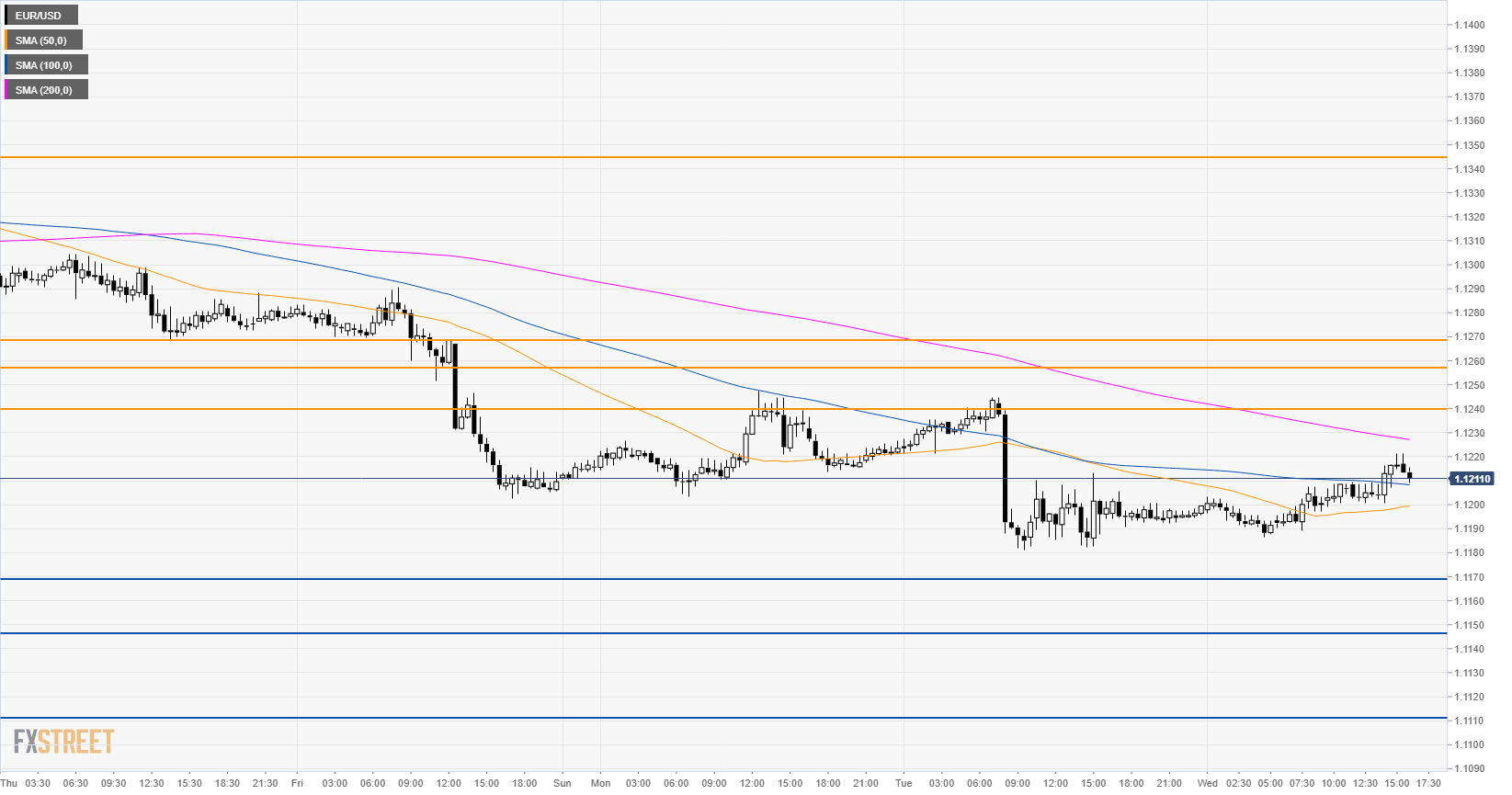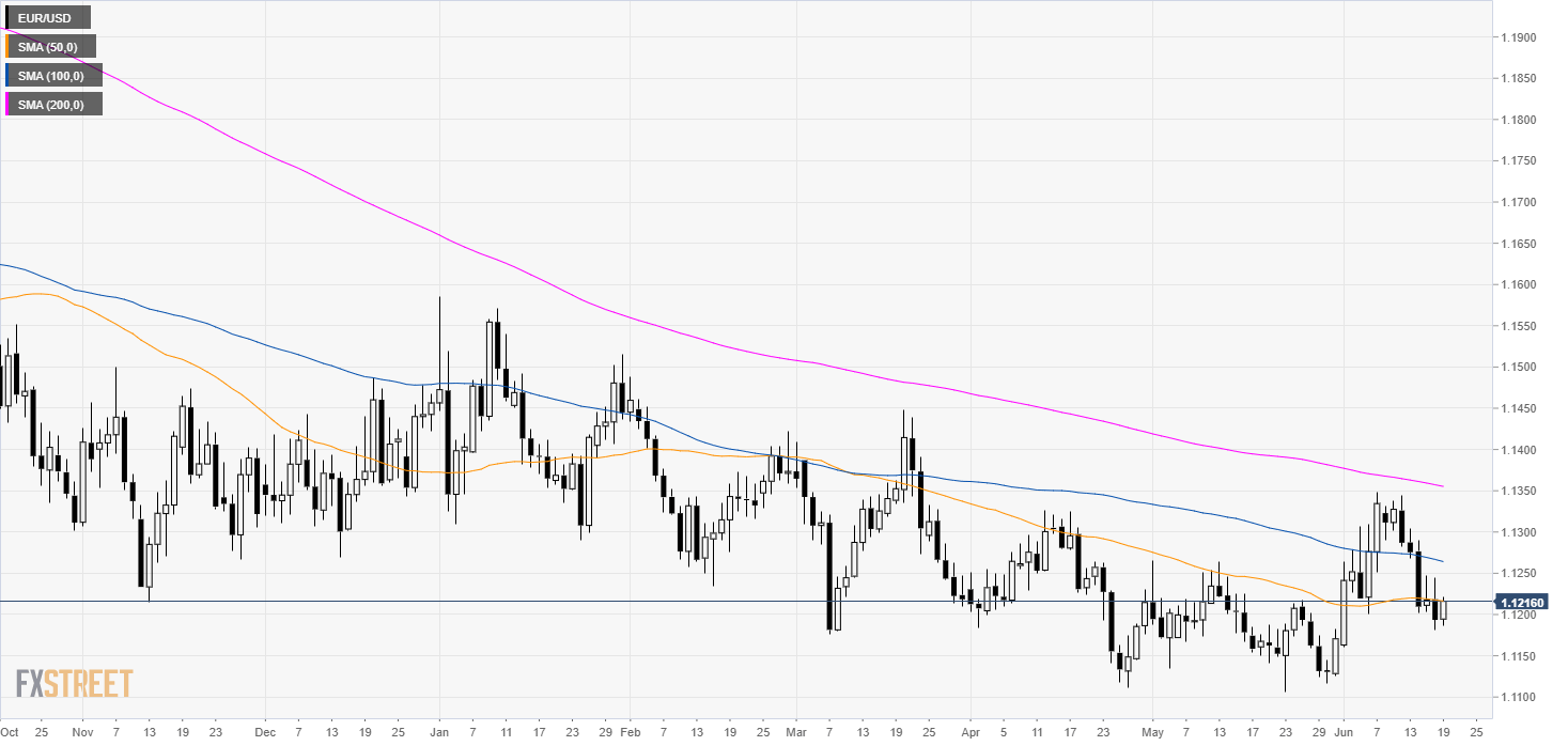 EUR/USD is trading in a bear trend below its main simple moving average (DSMA). The market has reclaimed the 1.1200 figure and is testing the 50 SMA at 1.1216.
