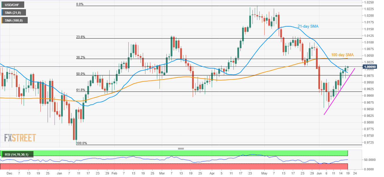 USD/CHF technical analysis: Bulls cheer 21-DMA break to target 1.0035/40 confluence