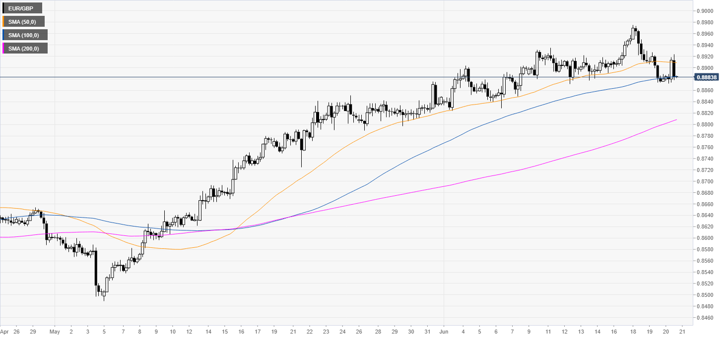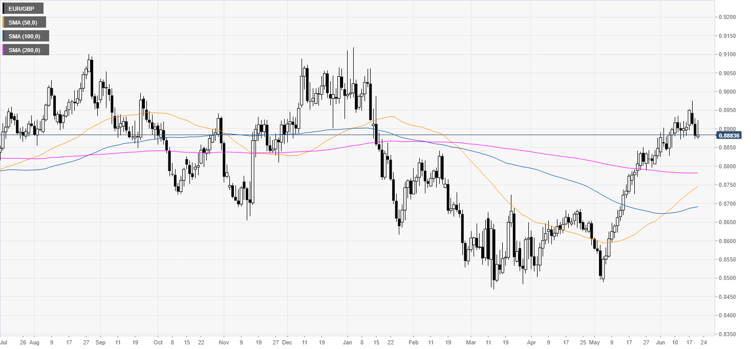 EUR/GBP is in a bull leg above its main simple moving averages (SMAs). The market attempted to break above Wednesday high but is currently under pressure below 0.8900 figure.