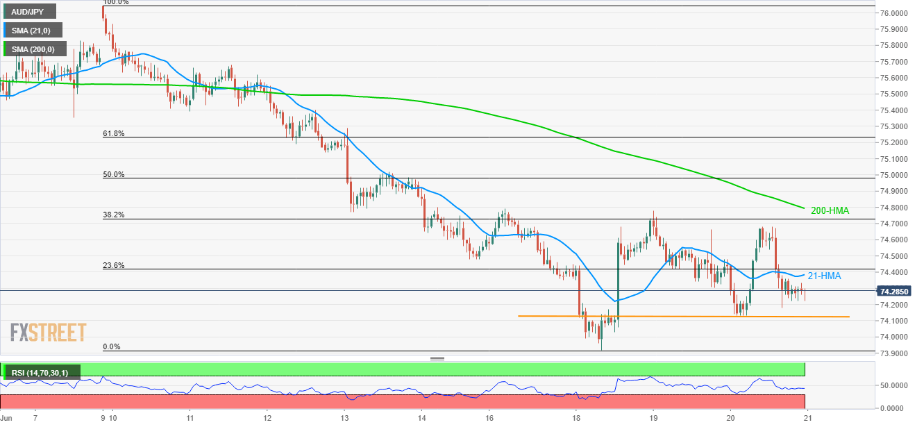AUD/JPY’s sustained trading below 21-hour moving average (21-HMA) currently drags the pair to 74.26 during early Friday.