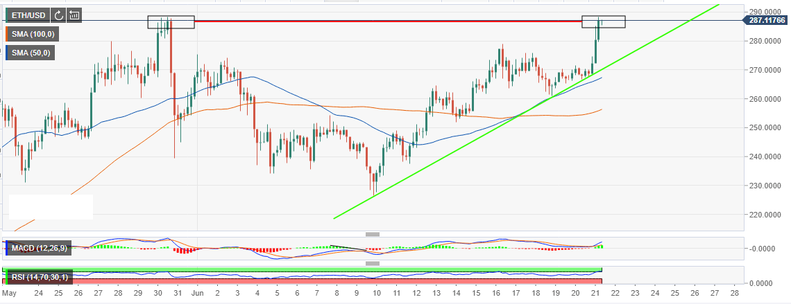 Ethereum followed in the footsteps of Bitcoin amid the end-week surge. Bitcoin revamped the recovery on Thursday breaking above $9,500. This encouraged the bulls who increased their entries sending BTC above $9,800 for the first time this year. Ethereum bulls poked by Bitcoin’s recovery retuned gun blazing and propelled the price above the recent hurdle at $280.
