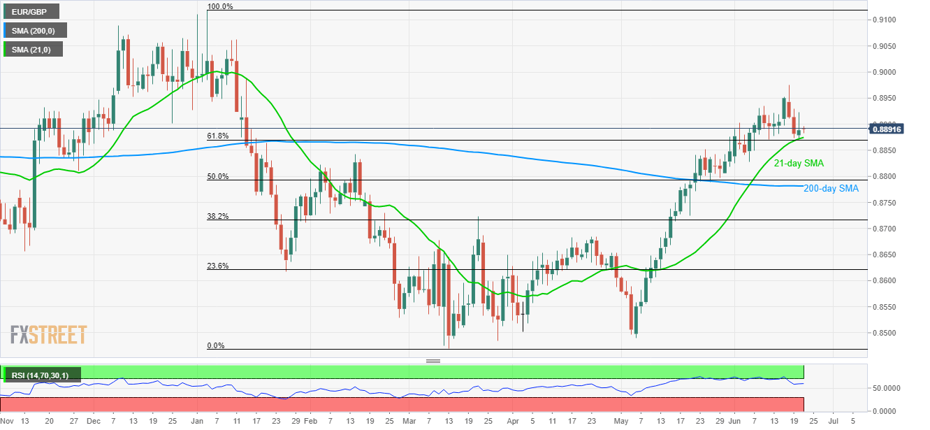 Failure to decline below the 21-day simple moving average (SMA) and 61.8% Fibonacci retracement of January – March declines presently portrays the EUR/GBP pair’s U-turn as it takes the rounds to 0.8891 while heading into Europe markets’ open on Friday.