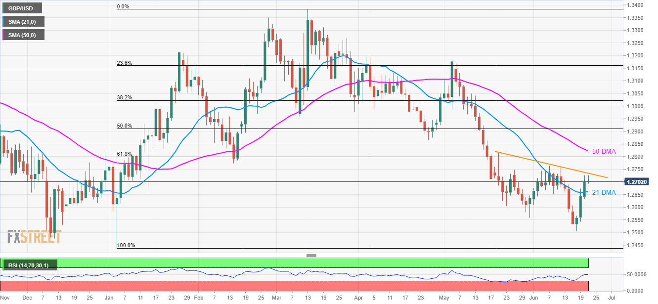 Even if the successful break of the 21-day moving average (DMA) propels the GBP/USD pair to more than a week’s high, 4-week old descending trend-line presently limits the upside as the quote seesaws near 1.2700 ahead of the UK open on Friday.