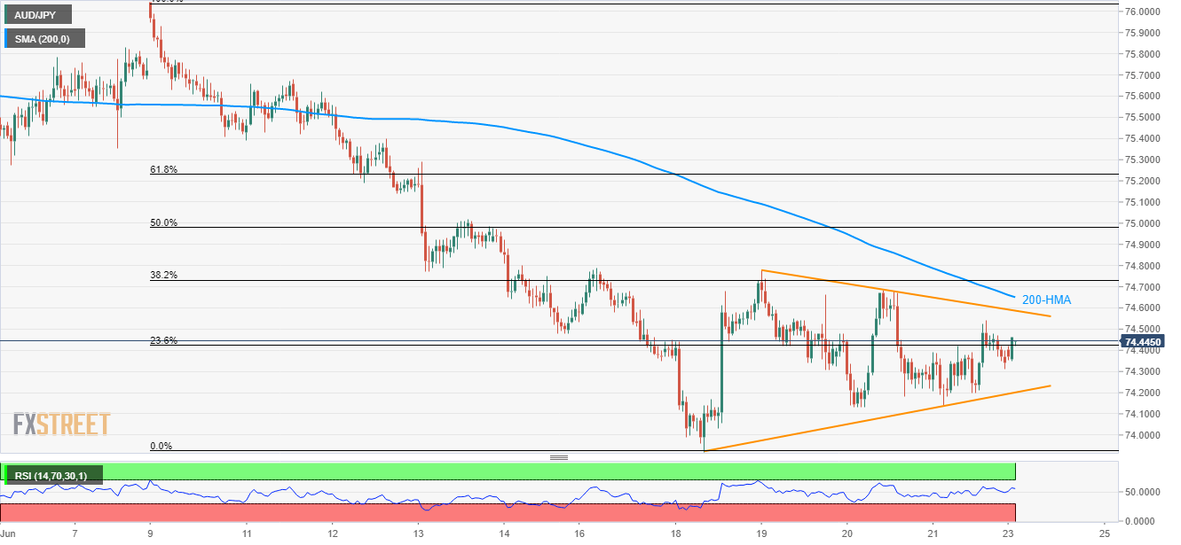 Gradual recoveries from 74.20 help the AUD/JPY pair to take the bids near 74.45 during early Monday. However, short-term symmetrical triangle and 200-HMA can confine the pair’s immediate moves.