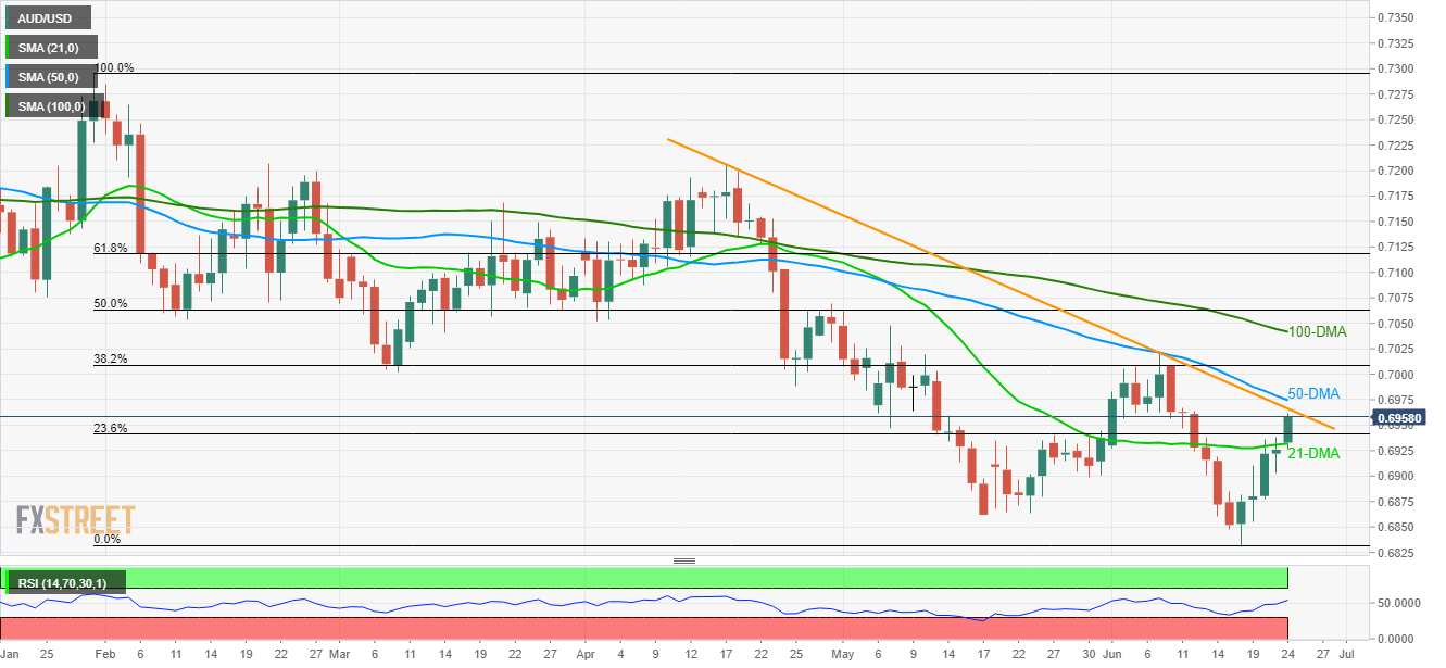 With the AUD/USD pair running further up from 21-day moving average (21-DMA), buyers concentrate on near-term key resistances to justify the latest upside as the quote takes the rounds to 0.6960 during early Monday.