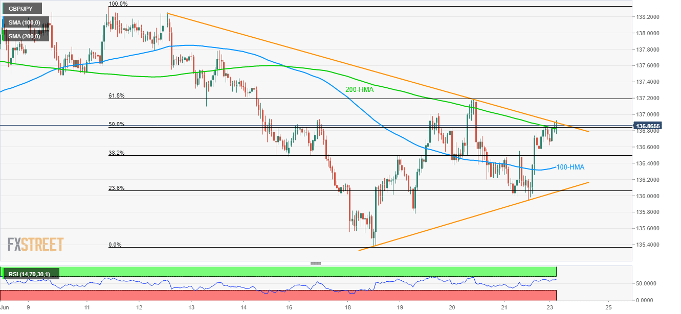 GBP/JPY breaks 200-HMA but is yet to cross 12-day long resistance-line as it takes the rounds to 136.85 during early Monday.