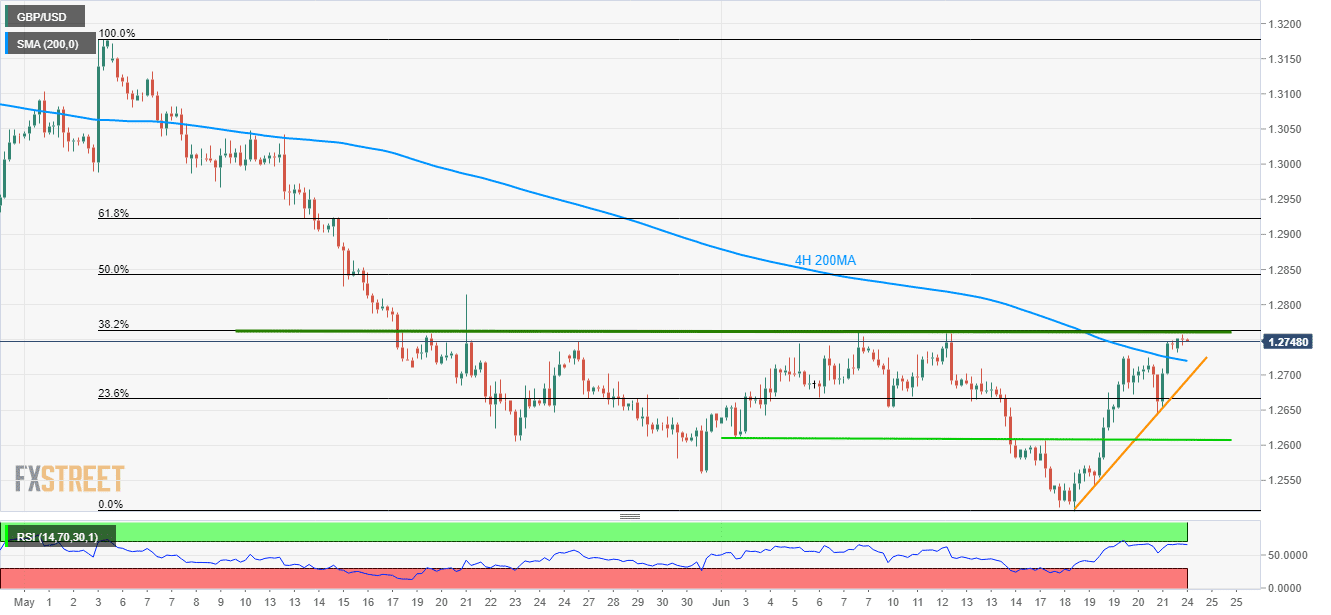 - Overbought RSI on a short timeframe, 38.2% Fibonacci retracement challenge GBP/USD buyers.