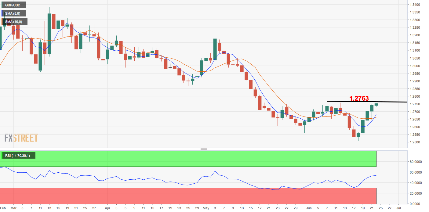 GBP/USD is trading on a positive note for the fifth straight day and is on track to test resistance at 1.2763 (June 7 high).