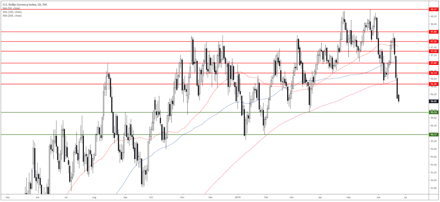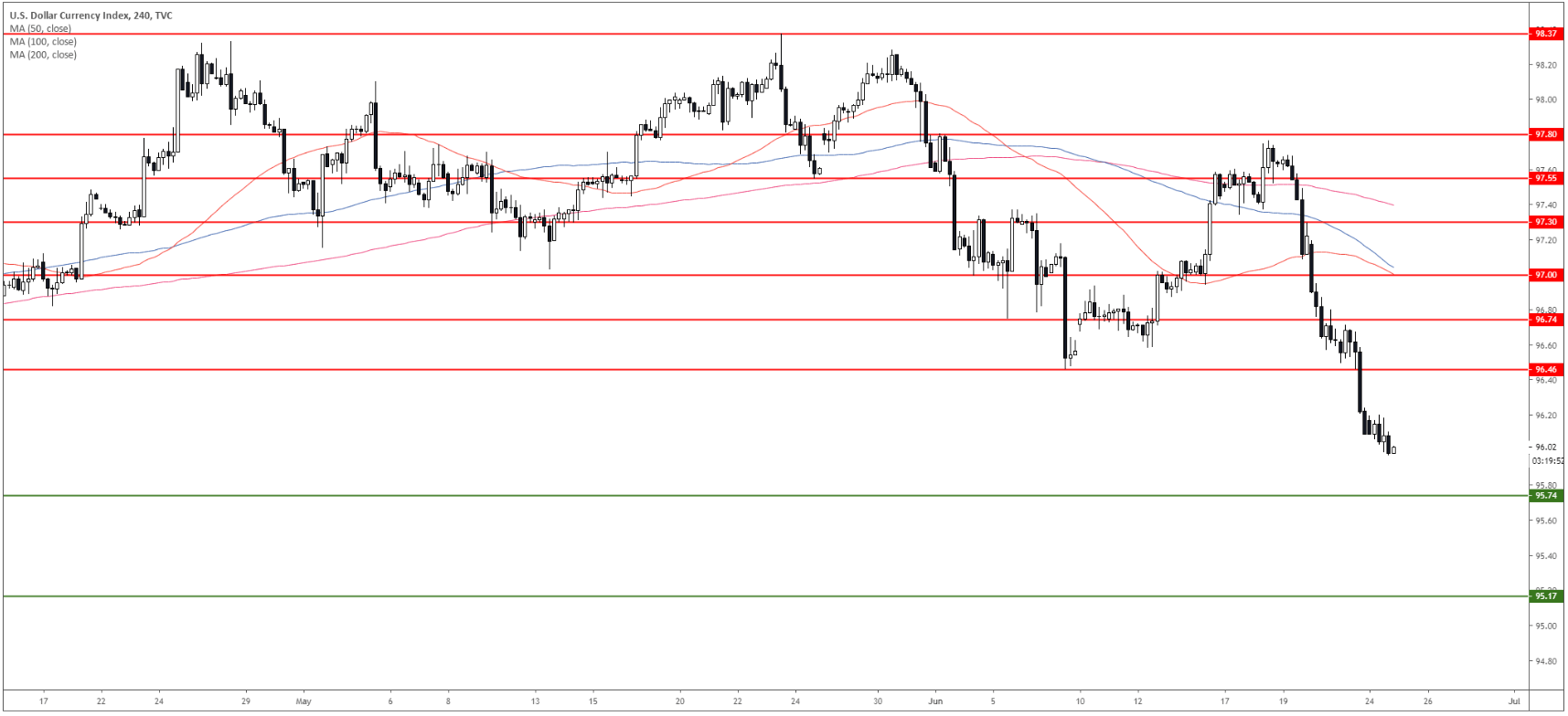 The US Dollar Index (DXY) broke below 96.46 key support and the 200-day simple moving average (DSMA) suggesting that the bear are taking control.