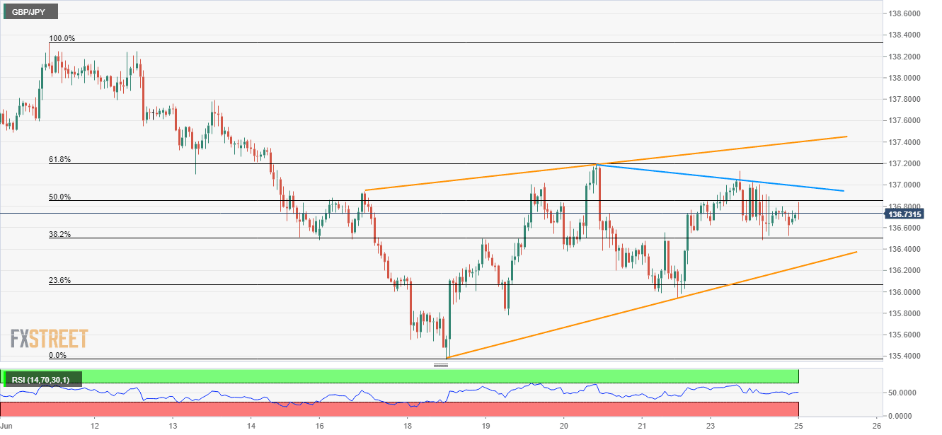 With its repeated upswings from 38.2% Fibonacci retracement of mid-June declines, the GBP/JPY pair again aims to confront nearby trend-line resistance as it trades near 136.76 during early Tuesday.