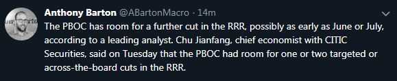 The People’s Bank of China (PBOC) has room for a further cut in the reserve requirement ratio and may deliver one as early as June or July, Chu Jianfang, Chief economist with CITIC Securities said on Tuesday, according to a tweet put out by MNI Anthony Barton.