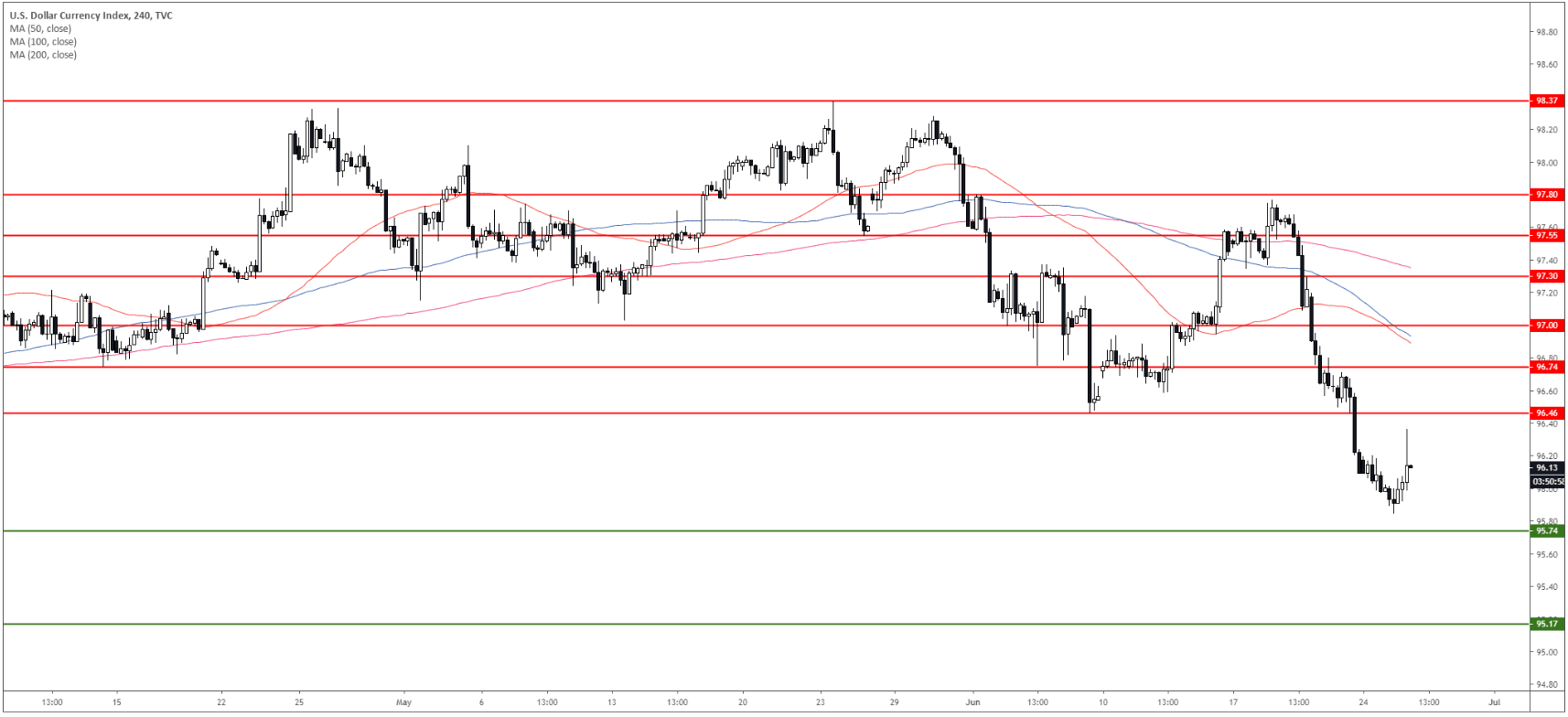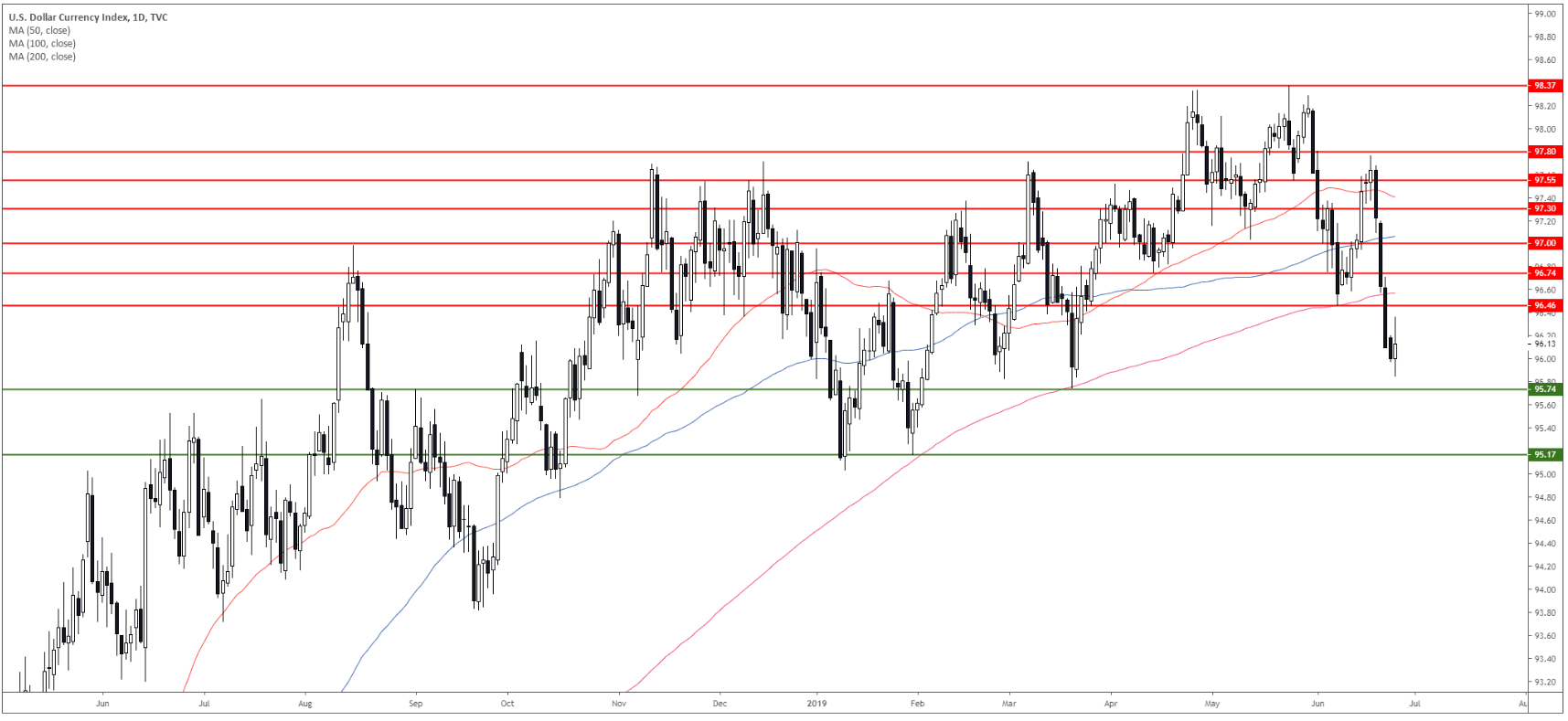 The US Dollar Index (DXY) broke below 96.46 key support and the 200-day simple moving average (DSMA) putting the bull trend at risk.