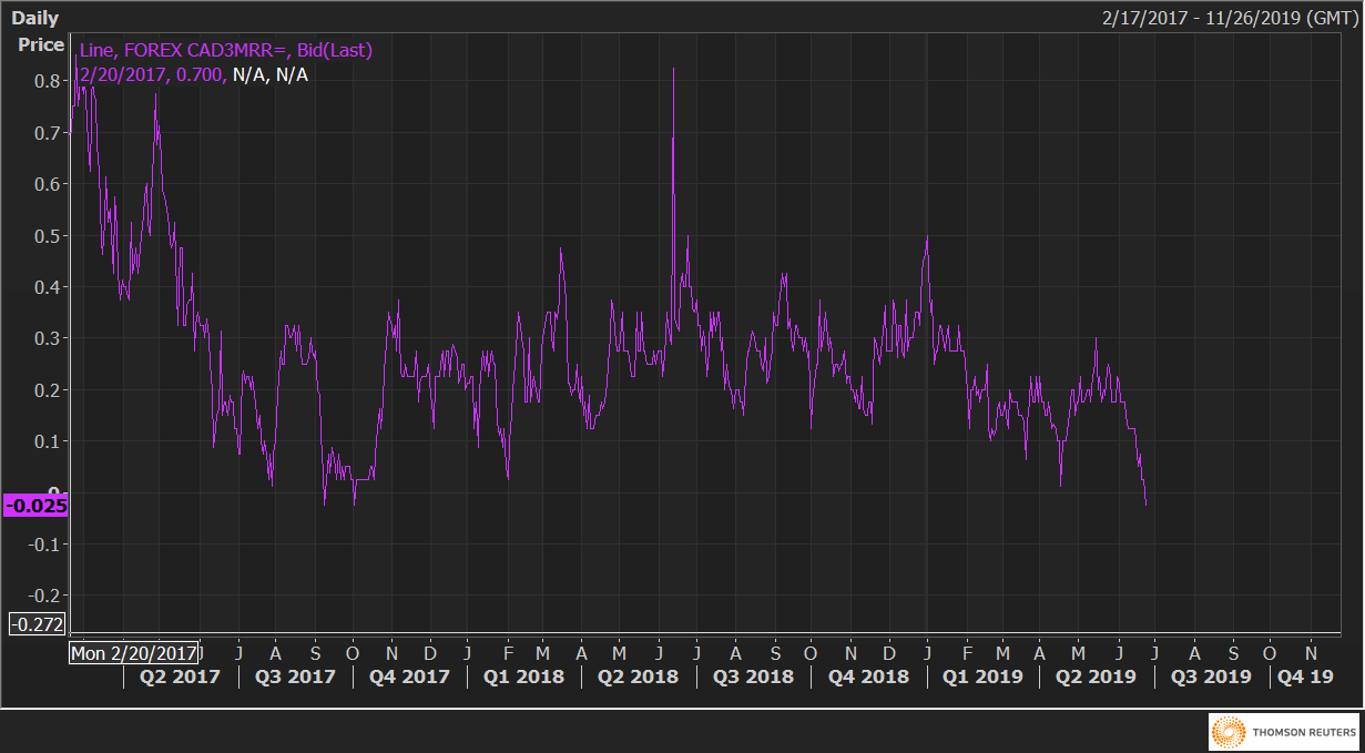 USD/CAD three-month risk reversals (CAD1MRR) have turned negative in favor of put options(bearish bets on USD/CAD) for the first time since October 2017.