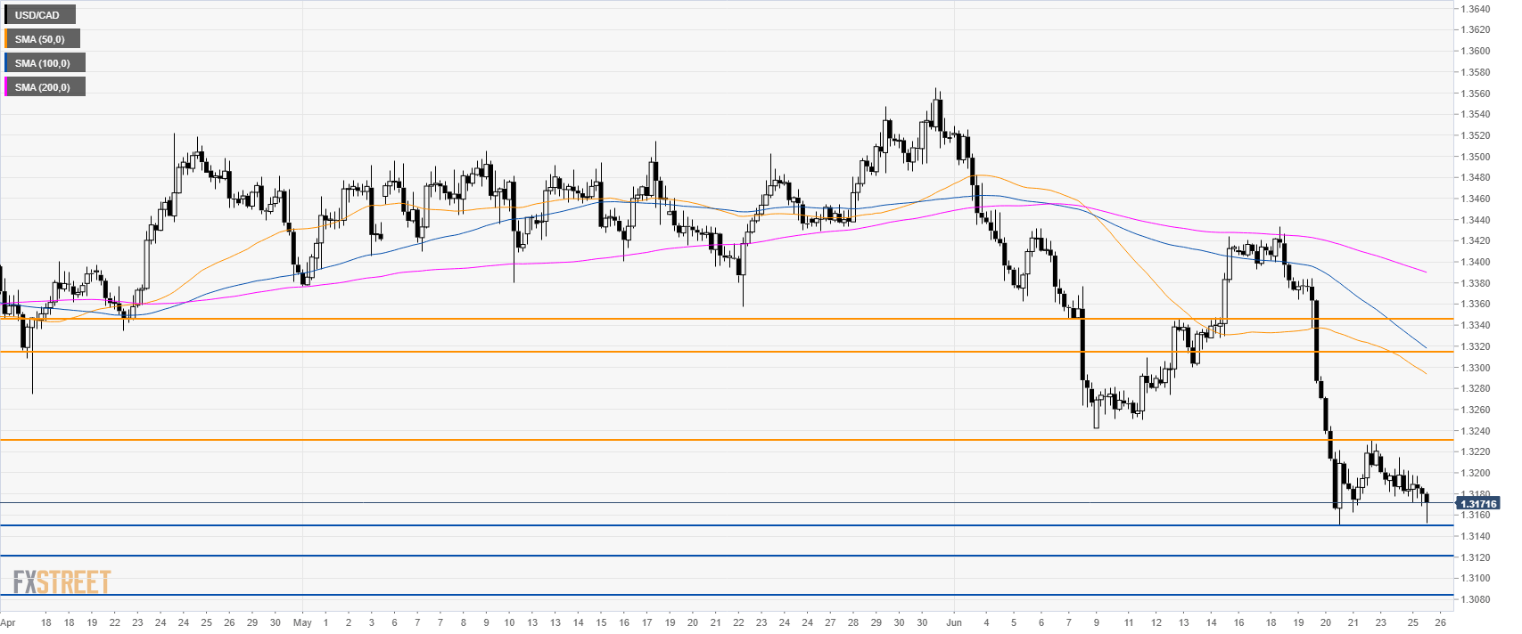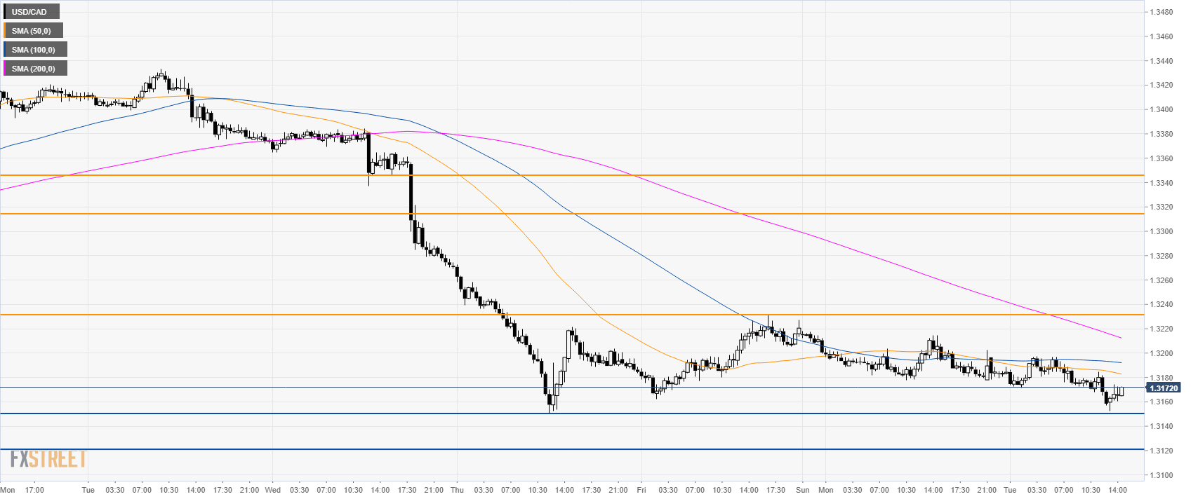 USD/CAD is under pressure below its main SMAs. Bears need to break below 1.3150 (last week low) to get to 1.3120 and 1.3084 swing lows.