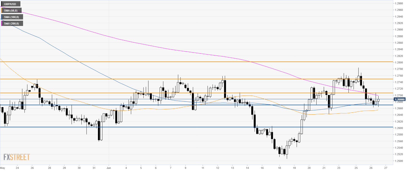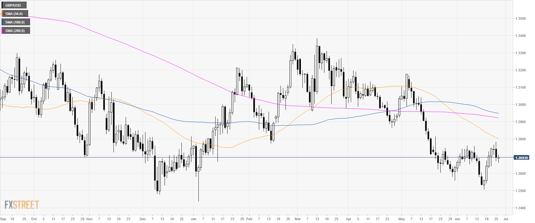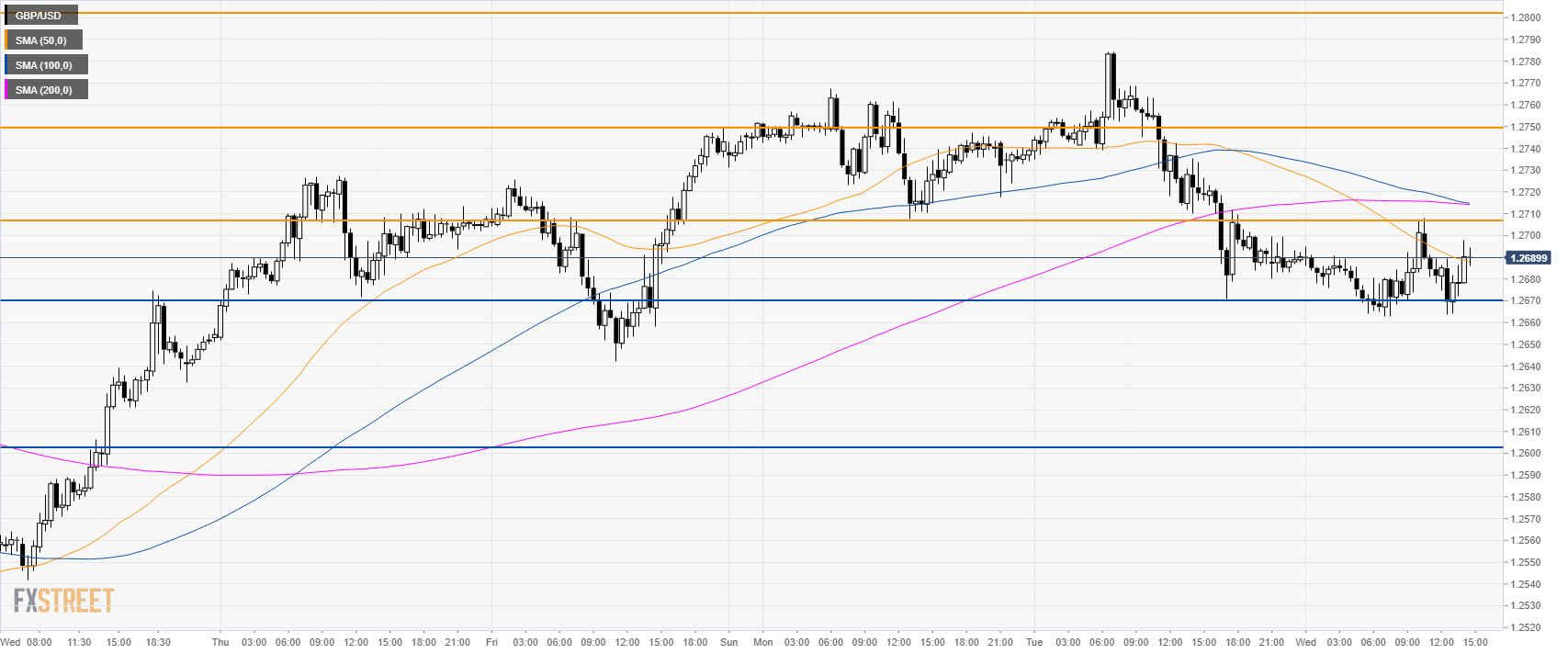 GBP/USD is trading in a bear trend below its main daily simple moving averages (DSMAs). The market is challenging the 1.2700 figure to the downside near weekly lows.