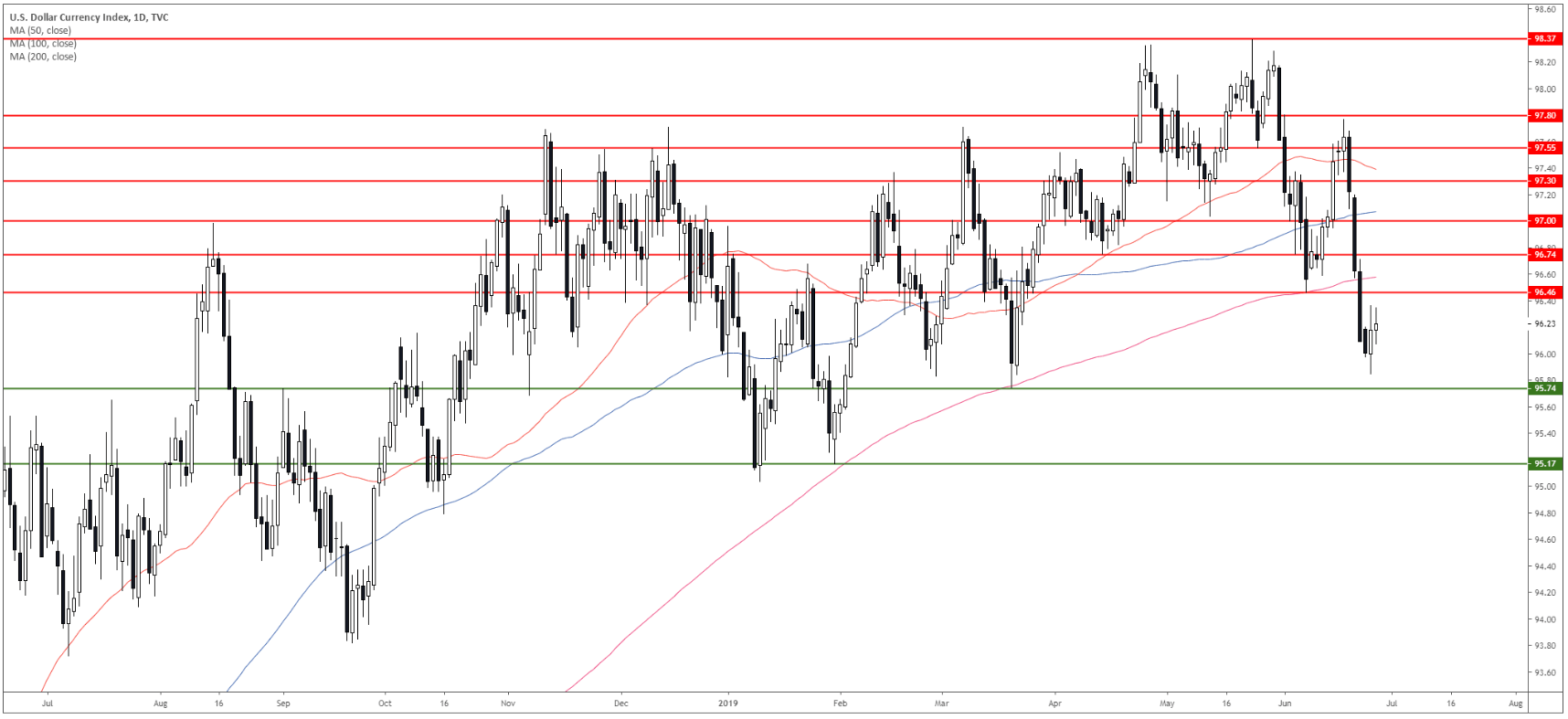 The US Dollar Index (DXY) fell below 96.46 key support and the 200-day simple moving average (DSMA) suggesting that the bull trend might be at risk.