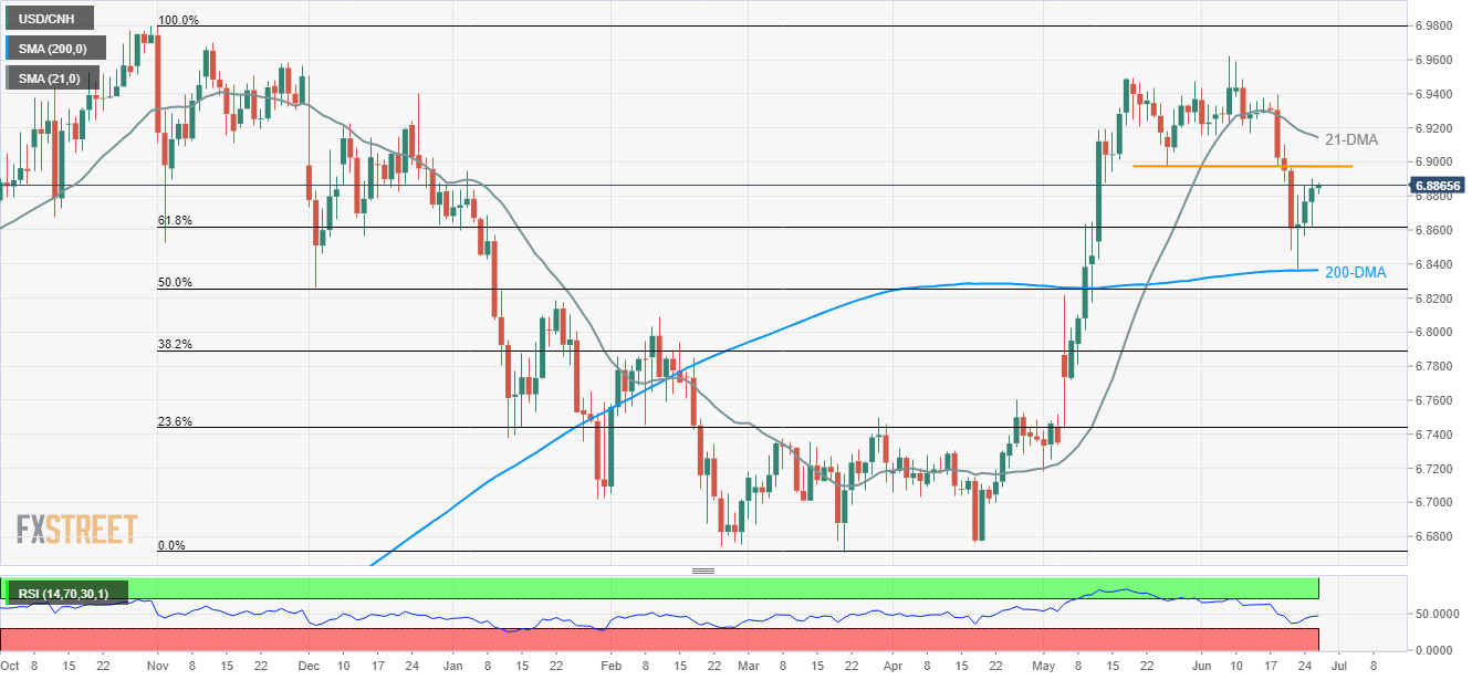 Having reversed from the 200-day simple moving average (SMA), the USD/CNH pair is aiming for the four-week-old horizontal resistance (previous support) as it trades near 6.8850 during the early Asian session on Wednesday.