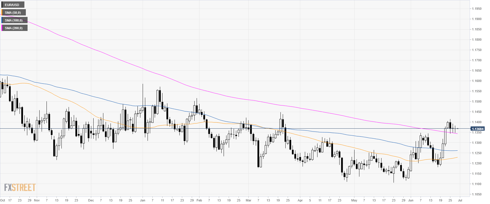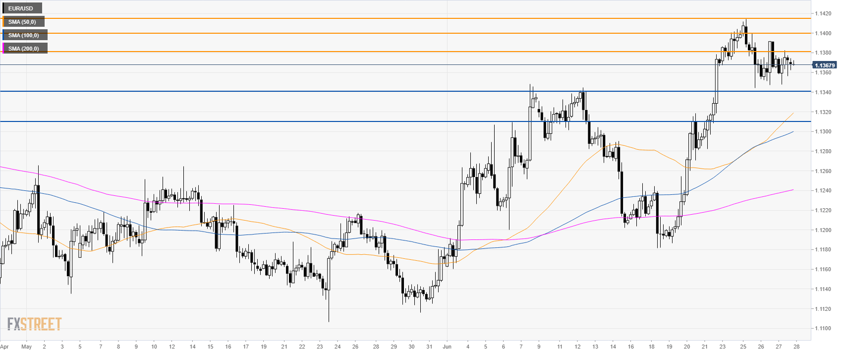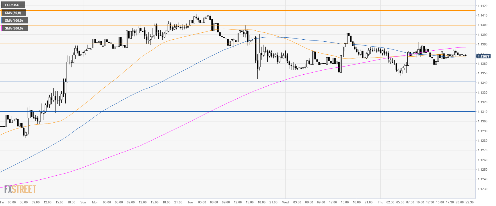 EUR/USD is weakening below 1.1380 resistance and its 200 SMA suggesting a potential retracement down in the short term. Resistances are at the 1.1380 level and 1.1400 figure, according to the Technical Confluences Indicator.