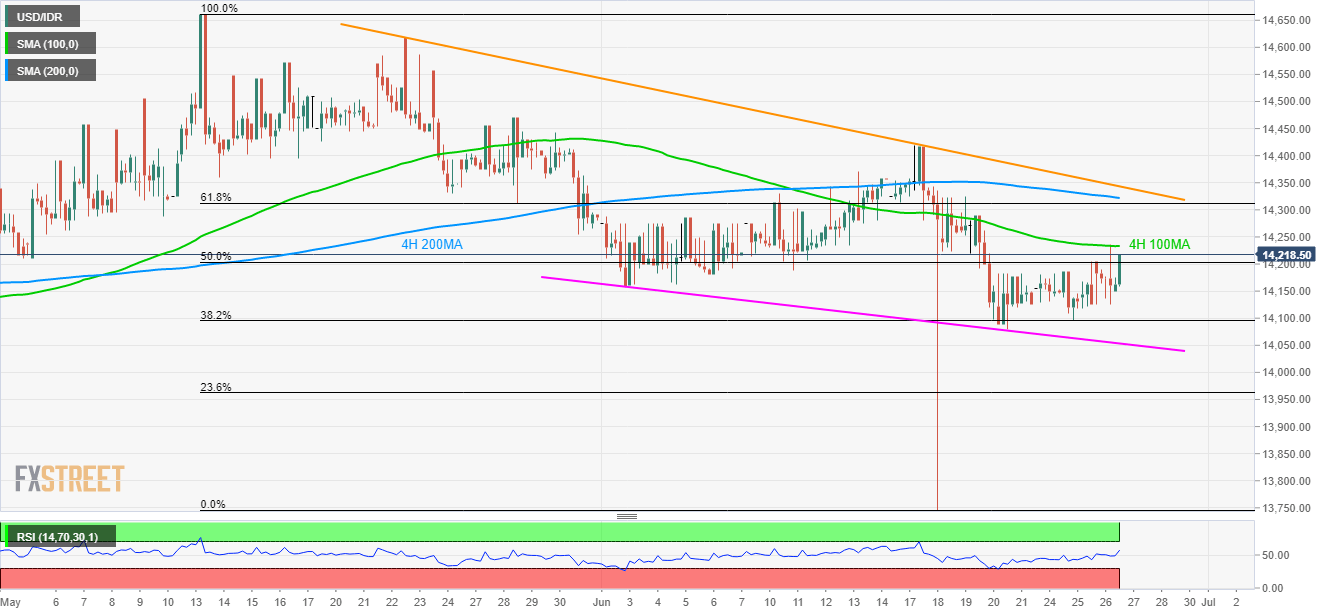 While sustained trading beyond 38.2% Fibonacci retracement currently propels the USD/IDR pair to flash 14,218 during the early Asian session on Thursday, the pair still has some key resistances to break in order to justify the latest strength.