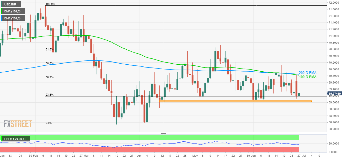 With the 100 and 200-day exponential moving averages (EMA) limiting the USD/INR pair’s immediate upside, the quote is taking the rounds to 69.25 during early Thursday.