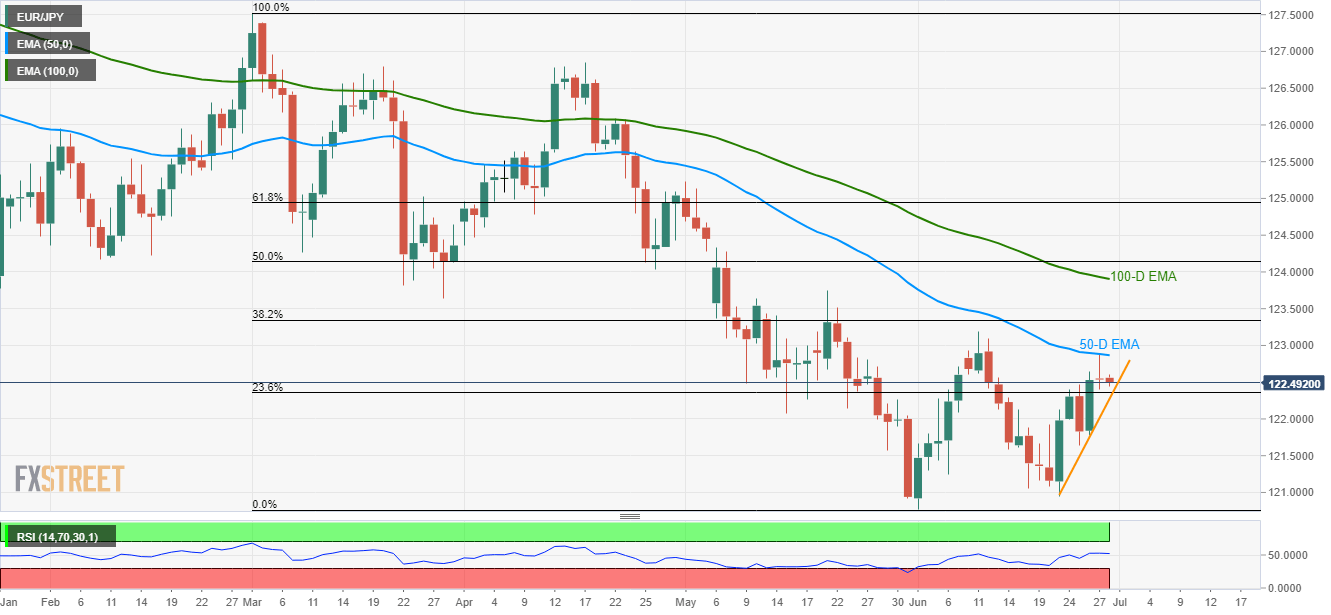 Failure to cross 50-D EMA seems to drag the EUR/JPY pair back to a week old support-line as it declines to the intra-day low of 122.45 during the early Asian session on Friday.