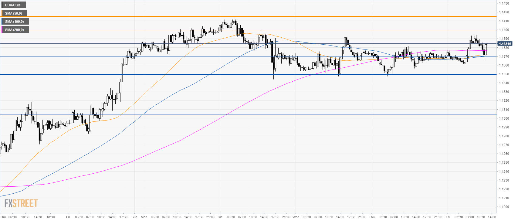 EUR/USD is fading below 1.1400 resistance suggesting a potential pullback down in the short term. Resistances are at the 1.1400 figure and 1.1419 level.
