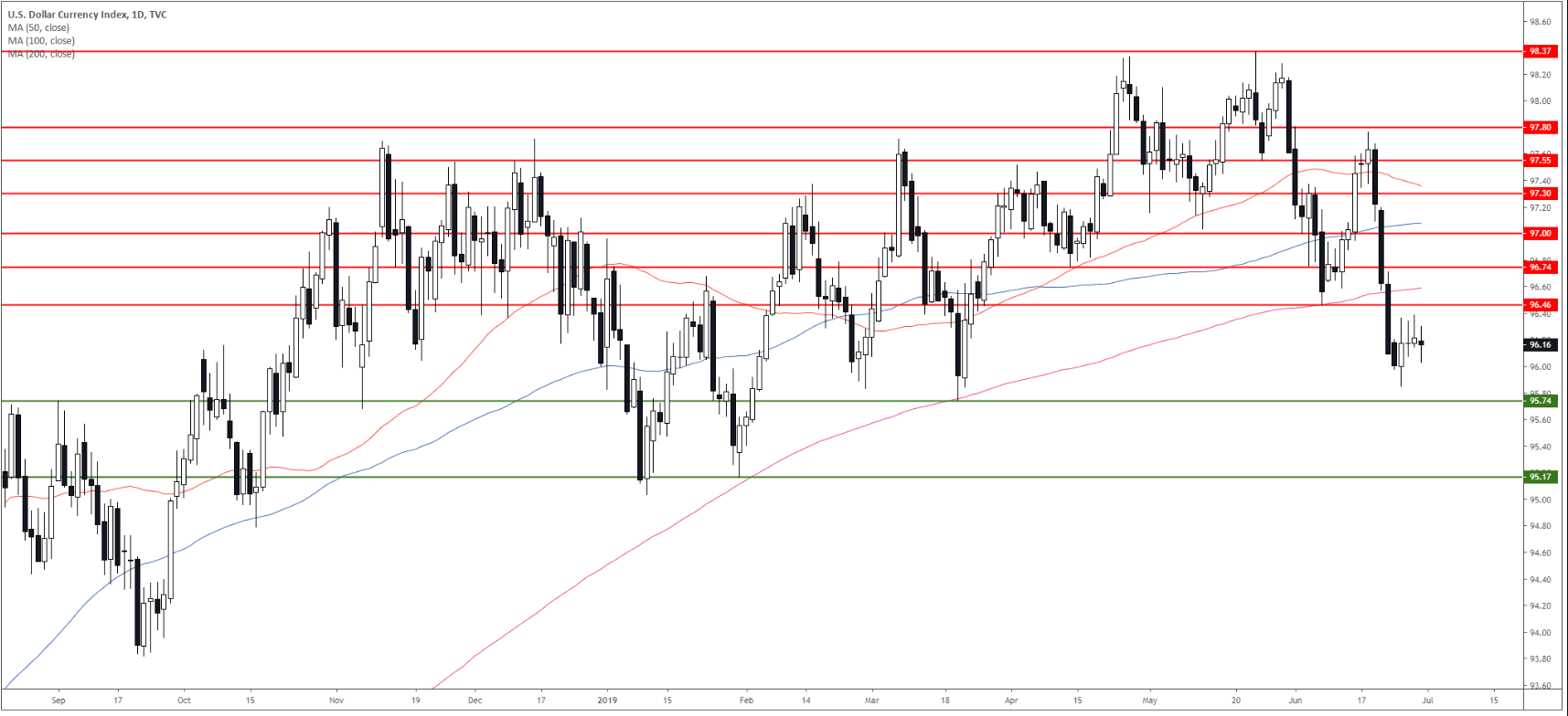The US Dollar Index (DXY) dropped below 96.46 key support and the 200-day simple moving average (DSMA) suggesting a potential halt to the bull trend. DXY is about to end the week virtually unchanged.